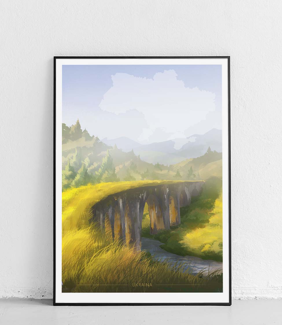 This poster depicts a unique region, Ukraine. The poster Ukraine shows a beautiful view of the picturesque 19th-century stone railway viaduct over the Prut River in Vorokhta. Worchota is located in Pokucie, on the border of Gorgany and Czarnohora, at an altitude of 748 m above sea level. It is a famous winter sports center and one of the most important tourist centers in the country, which is why this town has been called the "second Zakopane."