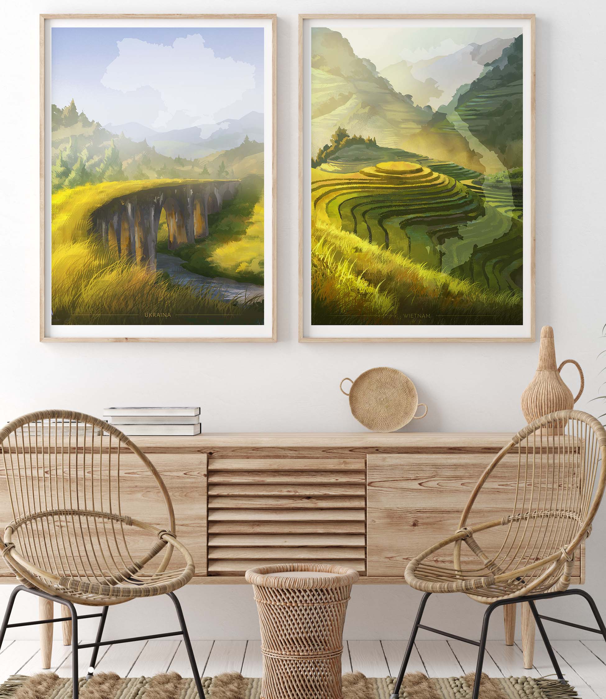 This poster from the "World Maps" series depicts the most beautiful countries in the world, often chosen as travel destinations by tourists from all over the world. The main theme, "Map," is presented in a subversive, unconventional way – it merely complements the depicted scenery, not its main element. The series aims to showcase the beauty of these countries, focusing primarily on nature, not urban development. Each poster depicts one of the most recognizable landscape elements of a given country. The entire "World Maps" series was created by Karolina Wiśniewska, a young artist from Tczew.