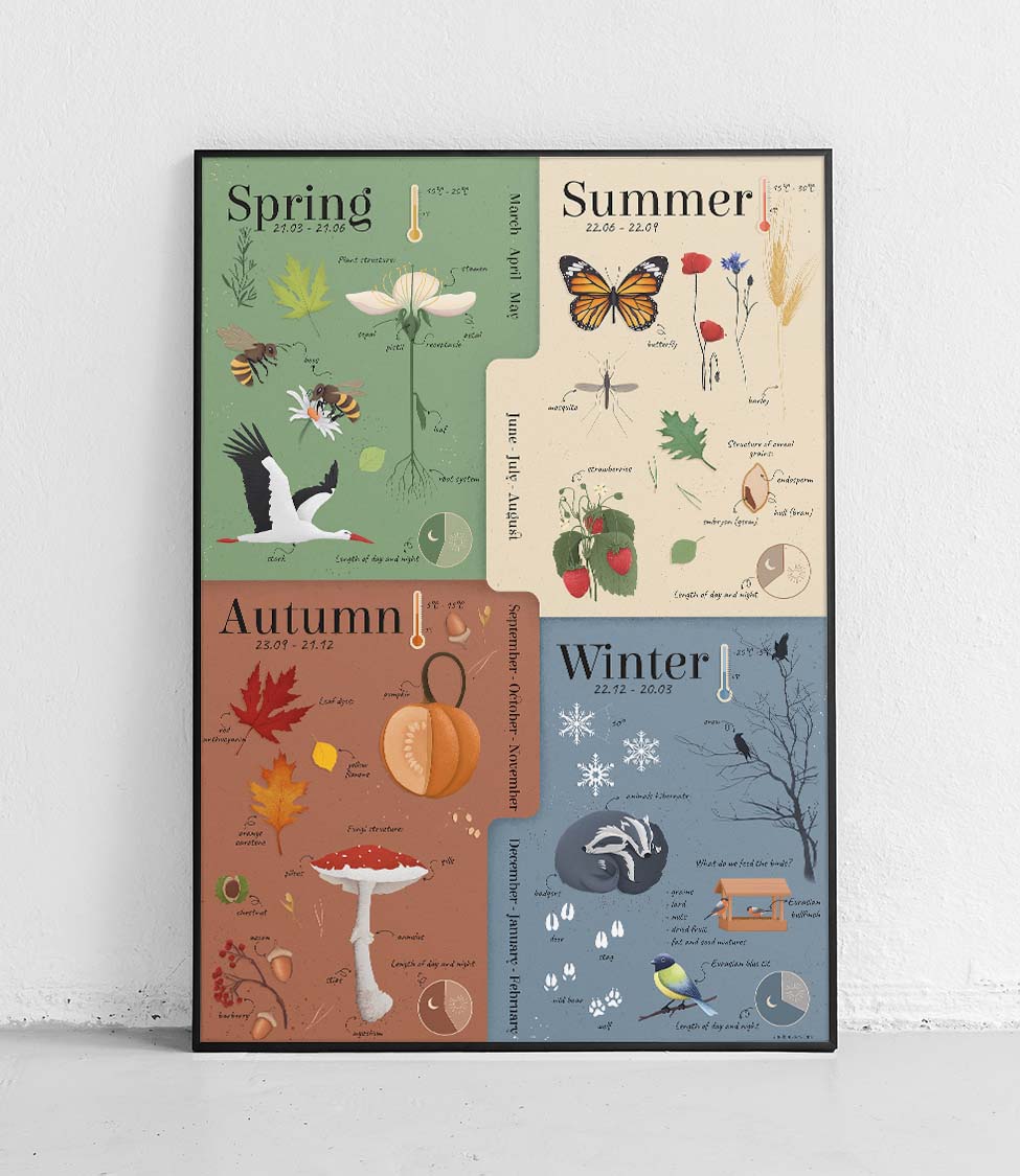 We wanted to showcase the elements characteristic of each season. A beautiful map depicting all the seasons on one poster allows you to expand your knowledge of nature and will certainly spark many interesting explorations and inquiries from children about the meaning behind each season.