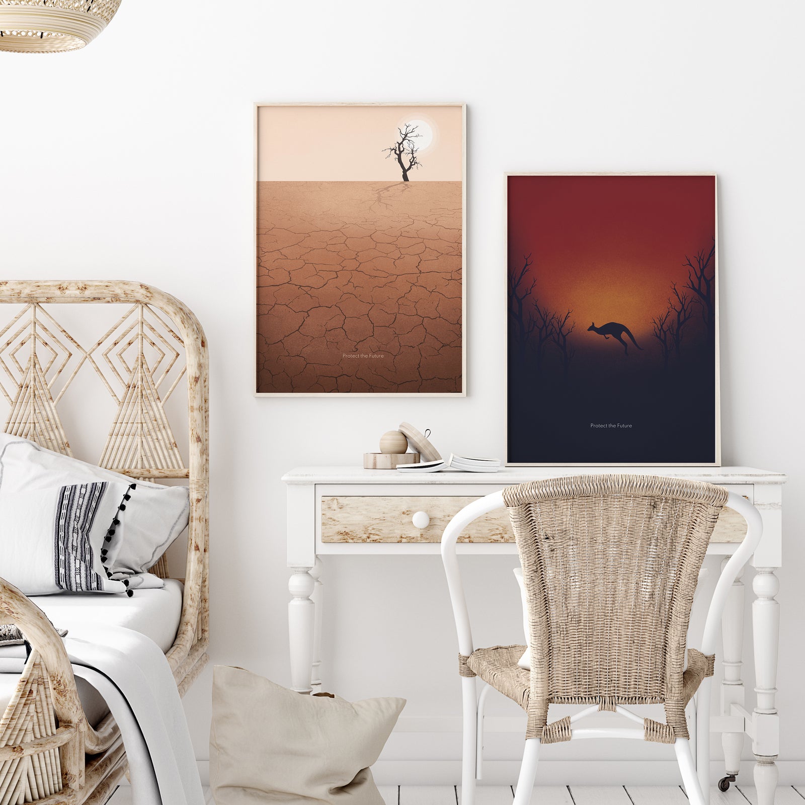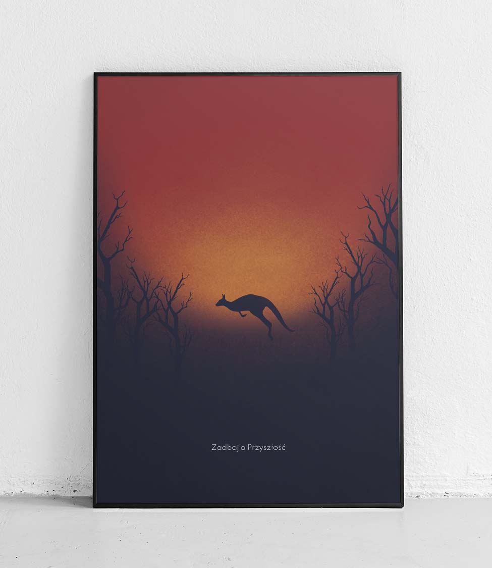 Posters from the "Ecological Posters" series depict the consequences of human activity on all four elements – fire, water, earth, and air. The series aims to promote environmental protection and active environmental education by raising awareness of sustainable consumption and conscious purchasing, shaping environmentally conscious attitudes, and developing sensitivity to topics related to ecology in its broadest sense. This poster depicts a kangaroo fleeing through the ashes of forests during the Australian bushfires. This is a reference to the element of fire and how human actions, such as leaving a cigarette butt in the forest, impact the entire ecosystem. The graphic was created by our Poznań-based artist, Kasia Nowakowska.