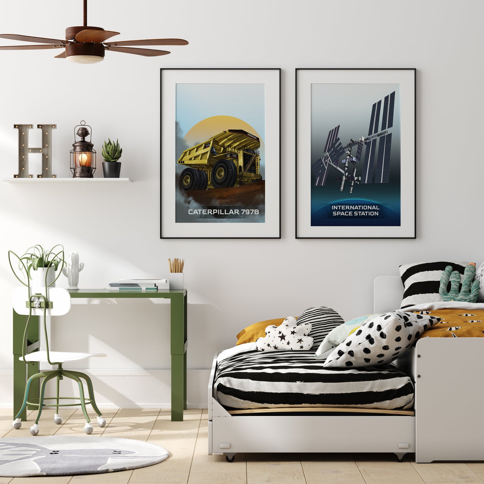 Built in 1978 for Rheinbraun, a mining company operating under the Krupp brand, this gigantic excavator remains the world's largest to this day. Weighing 13,500 tons, the Bagger 288 is used for open-pit work in a German lignite mine. Due to its considerable weight, the excavator's undercarriage is 46 meters wide and runs on three rows of four crawler tracks, each 3.8 meters wide. This means the track pressure on the ground is low, at approximately 17.1 N/cm². This allows the excavator to operate on any surface. However, the enormous weight of several thousand tons means that the excavator only reaches a speed of 0.1 to 0.6 km/h, or 2 to 10 meters per minute. The minimum turning radius is approximately 100 meters. In 2001, the excavator completely uncovered a mine in Hambach and was transported for further work to the Garzweiler open-pit mine, 22 km away. The transport took three weeks and cost 15 million marks. The machine's daily capacity is 240,000 tons of coal or 240,000 cubic meters of overburden, which is the equivalent of a hole the size of a football field and 30 meters deep. The coal extracted daily by the Bagger can fit on 2,400 wagons. The excavator operates 24 hours a day and is operated in three shifts. During operation, Friedrich Krupp AG must supply the excavator with 16.56 megawatts of electricity. This 13,500-ton colossus measures 240 meters long, 46 meters wide, and 96 meters high (the height of a 30-story skyscraper). The bucket wheel, which the excavator uses to scoop out coal, is mounted on a boom. The 21.6-meter-diameter head is equipped with 18 buckets, each with a capacity of 6.6 cubic meters.Jeśli kupisz również ramkę, zajmiemy się oprawą bez dodatkowych kosztów. Twój plakat dotrze już w ramie, gotowy, by zawisnąć na ścianie.