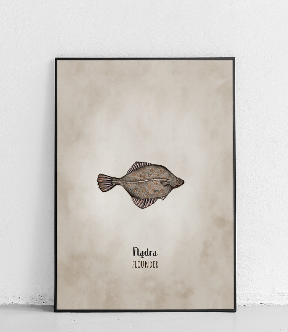The poster depicts a flounder and is one of 30 species of Polish animals featured on the children's map of Poland.