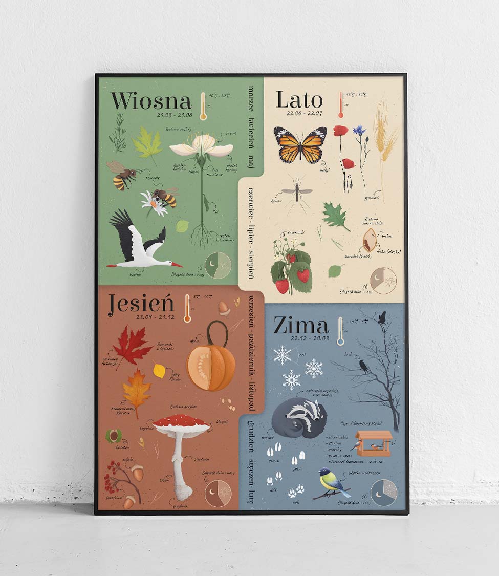 We wanted to showcase the elements characteristic of each season. A beautiful map depicting all the seasons on one poster allows you to expand your knowledge of nature and will certainly spark many interesting explorations and inquiries from children about the meaning behind each season.