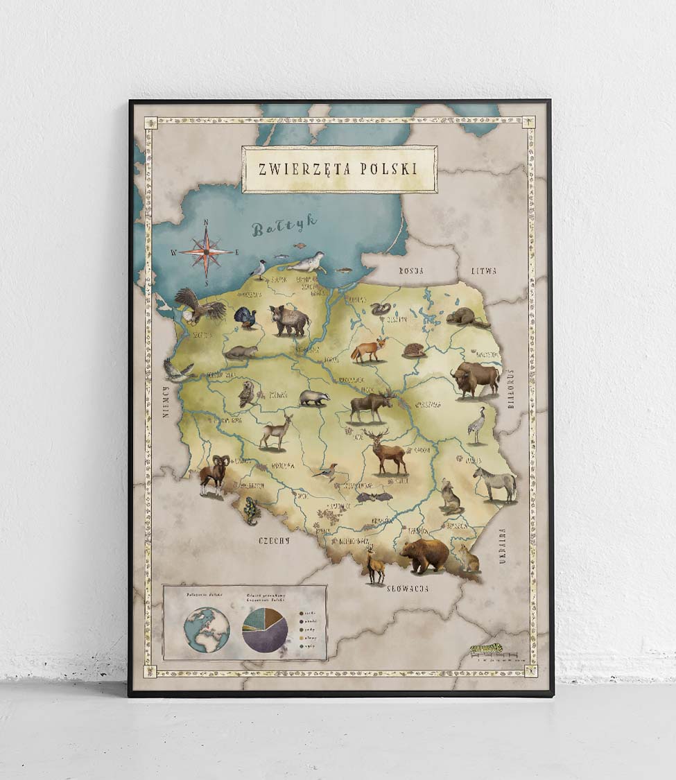 The map is surrounded by an intricate frame with animal tracks, and in its corners are representatives of the insect world. Discover the beauty of Polish nature with us!