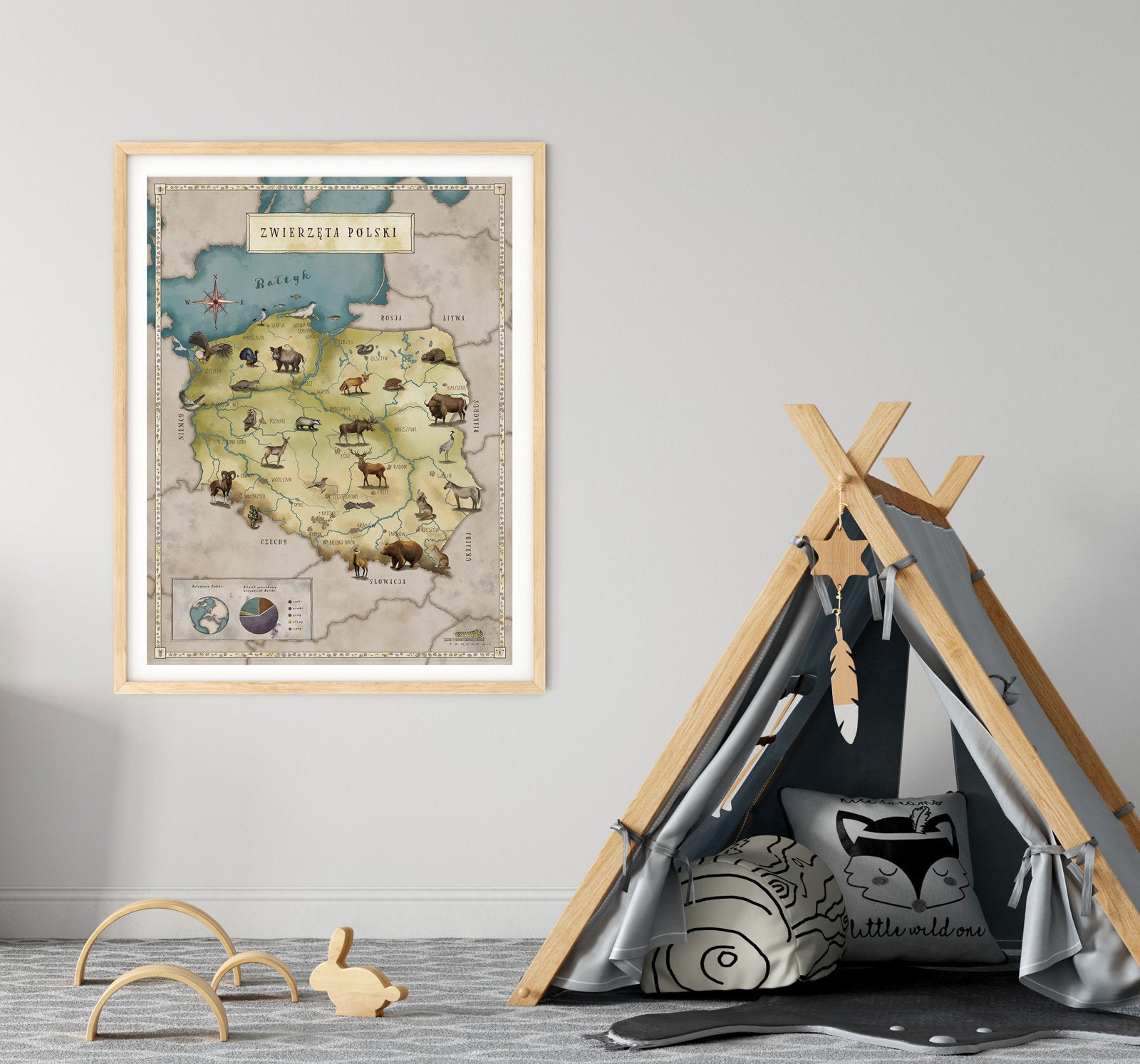 The poster-map presents Poland's fauna. We wanted to present animal species realistically, without losing the map's illustrative character. The beautiful map in subdued colors allows for expanding knowledge of nature and will certainly spark many interesting explorations and inquiries among young explorers.
