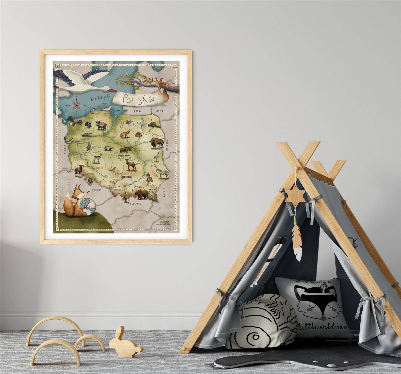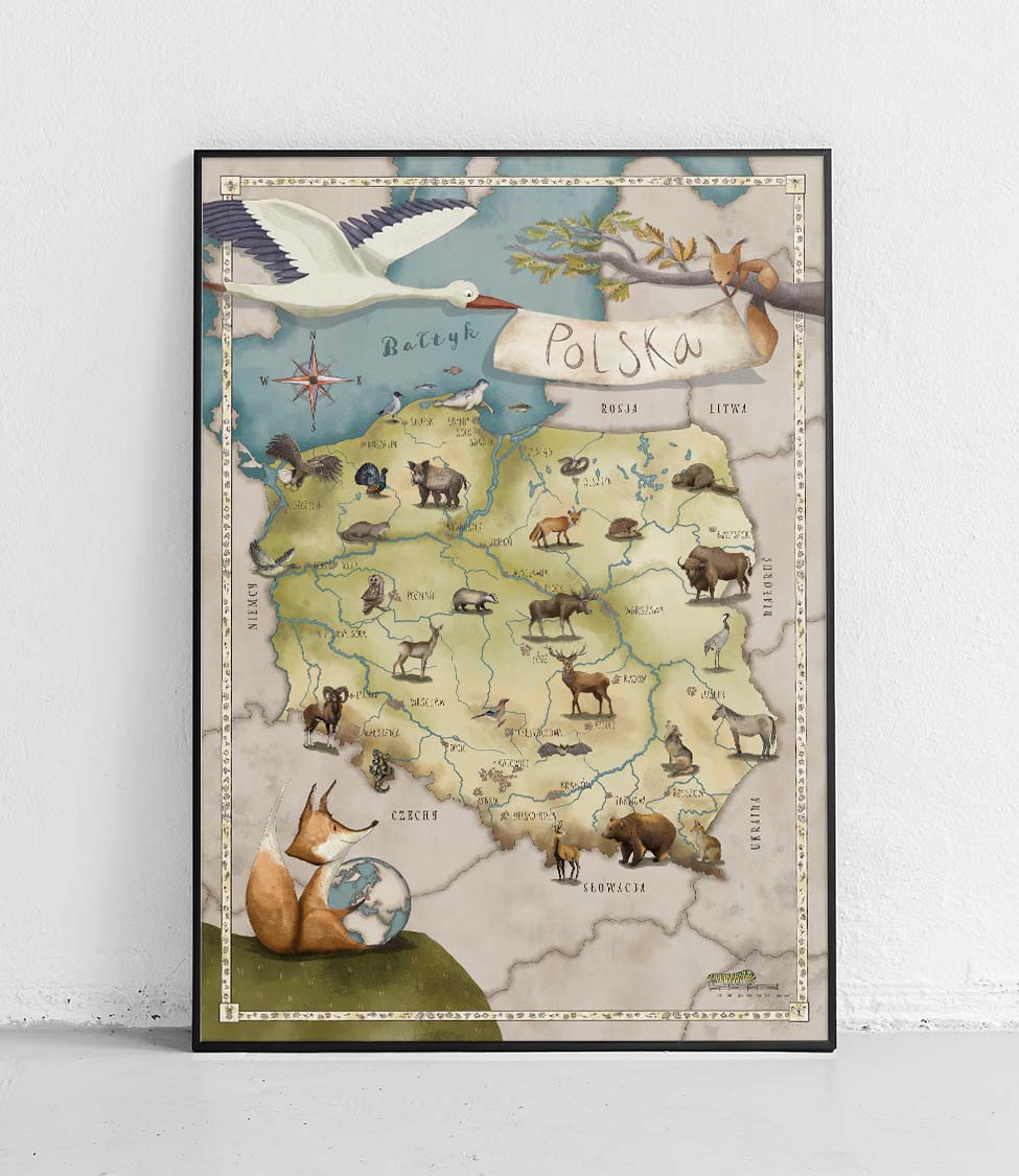 The map is surrounded by an intricate frame with animal tracks, and in its corners are representatives of the insect world. Discover the beauty of Polish nature with us! This version of the Map of Poland - Animals is designed for the youngest children, created by Joanna Czarnecka (Zojka).