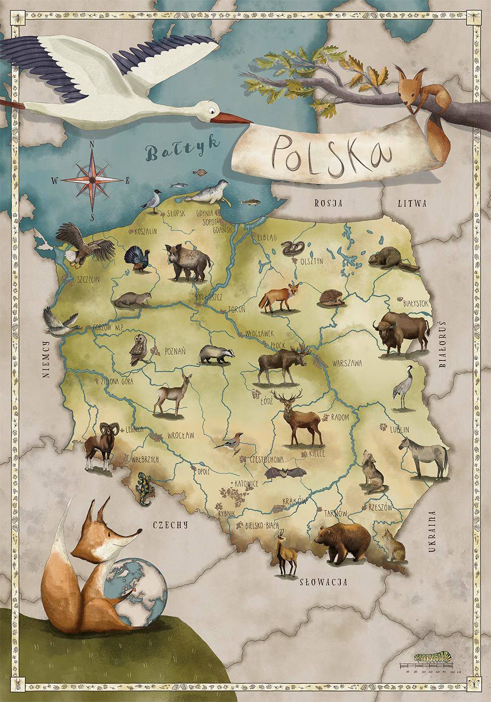The map features a total of 30 species of Polish animals – some more obvious than others. The first key to locating the animals was the symbols of the national parks: in the Bieszczady Mountains you'll find the lynx, the bat in Ojców National Park, the Tatra chamois in the Tatra Mountains, the seagull on the coast, and a white-tailed eagle proudly spreads its wings over Wolin National Park. Mammals such as roe deer, mouflon, badger, and grey seal could also be included on the map of Poland. Birds are represented by the jay, white-tailed eagle, colorful capercaillie, bean goose, jay, and crane. Reptiles are represented by the beautiful European adder, and amphibians by the extraordinary spotted salamander. Cod, flounder, and herring swim in the Baltic Sea. The distribution of other animals is based on the location of their most abundant populations. The poster also includes typical map attributes, such as a linear scale and a compass rose, which not only beautifully decorate the map but also provide educational value.