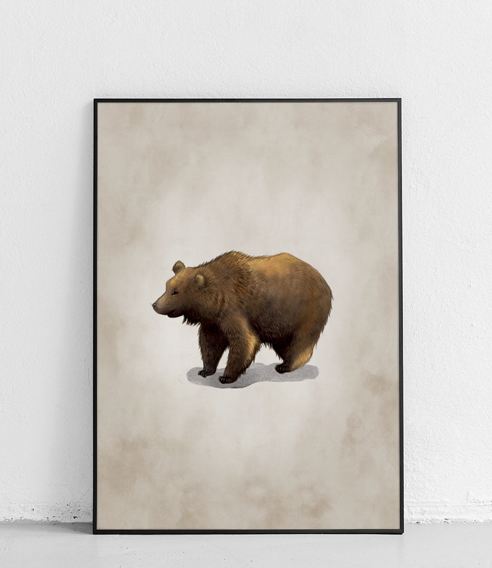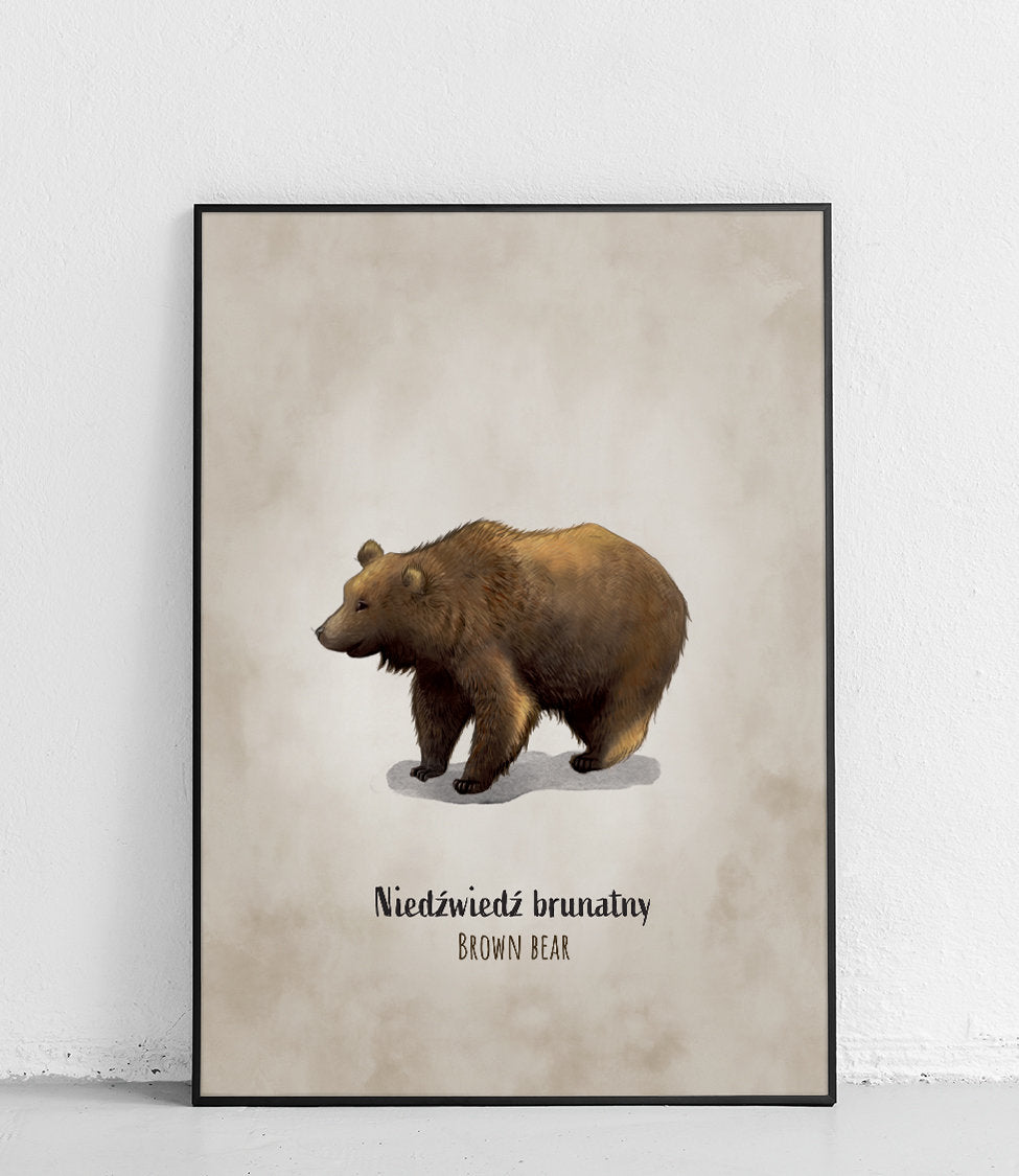 The poster depicts a brown bear and is one of 30 species of Polish animals featured on the children's map of Poland.