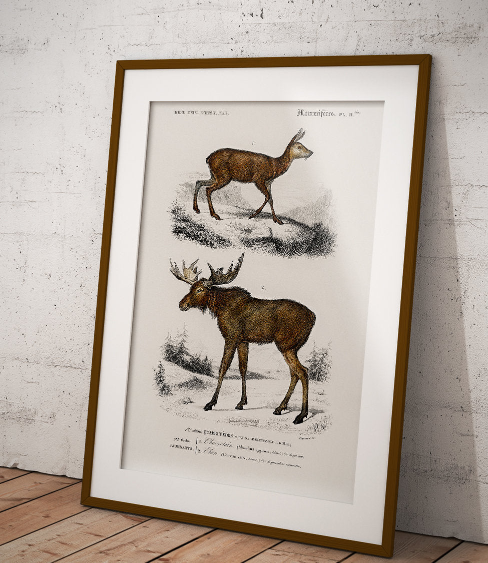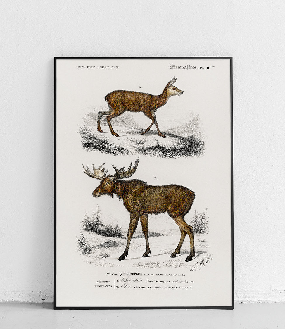 The accompanying illustration depicts a Eurasian moose (Cervus alces) and a musk deer (Moschidae).