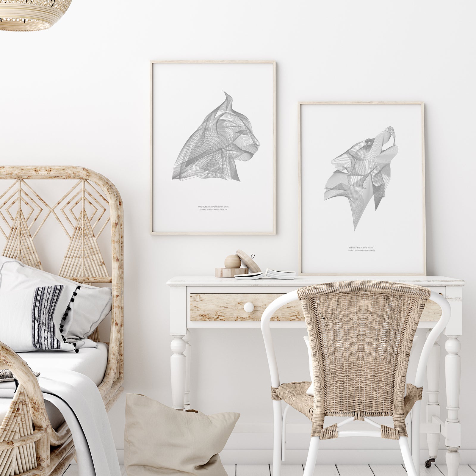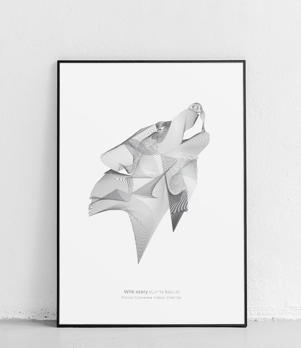 This poster from the "Red Data Book of Animals" series depicts the gray wolf (Canis lupus) – a species of predatory mammal from the canid family, inhabiting forests, plains, wetlands, and mountains of Eurasia and North America. In 2018, official statistics indicated that the wolf population in Poland numbered approximately 1,500 individuals, while foresters estimated that there could be as many as 2,500. It is listed in the Polish Red Data Book of Animals and is strictly protected.