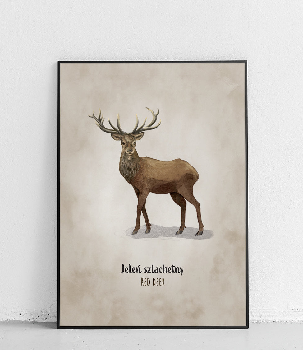 The poster depicts a red deer and is one of 30 species of Polish animals featured on the children's map of Poland.