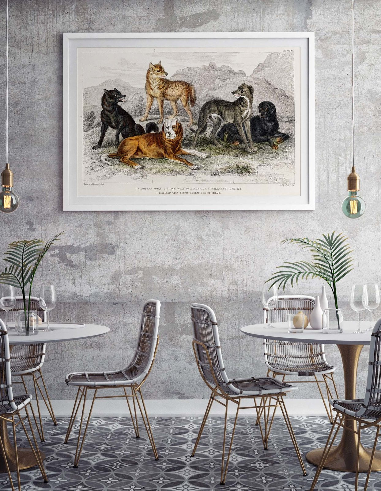 This original illustration of "Dogs and a Wolf" (Tibetan Mastiff, Greyhound, St. Bernard, and European Wolf) from the "Animals" series was created by Oliver Goldsmith (1728-1774), an Irish physician and writer.