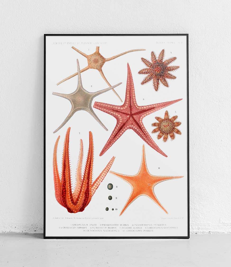 The Starfish poster is an original illustration of a set of starfish varieties. The illustration comes from the Résultats des Campagnes Scientifiques by Albert I, Prince of Monaco (1848-1922). Original from the Biodiversity Heritage Library.