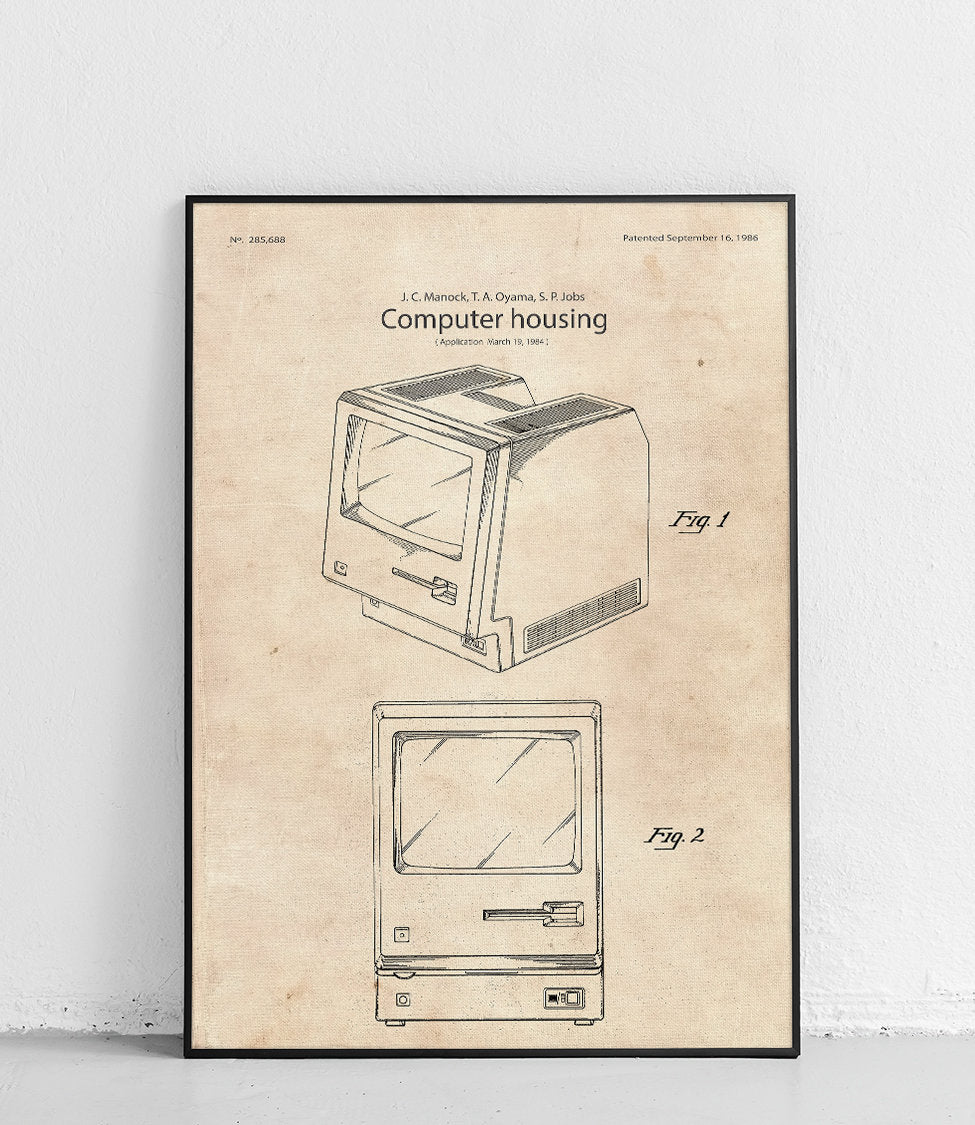 A poster featuring a patent reproduction of a computer case by Steven P. Jobs, Jerrold C. Manock, and Terrell A. Oyama.
