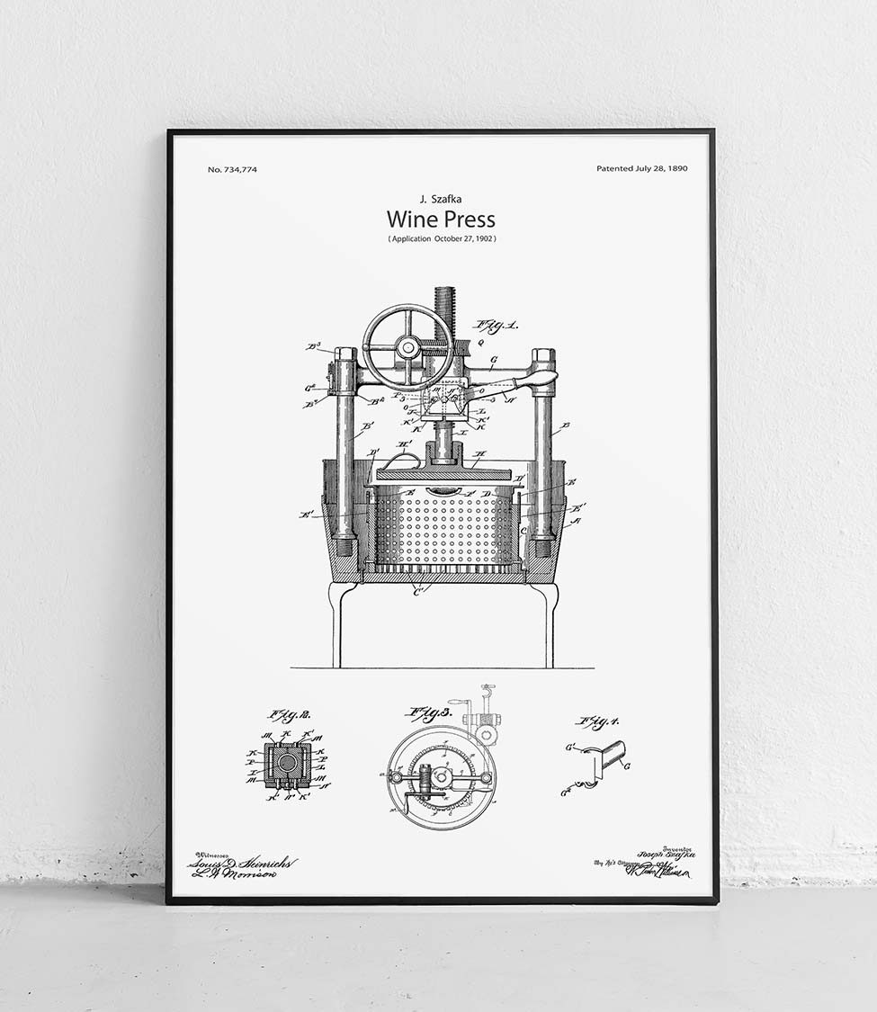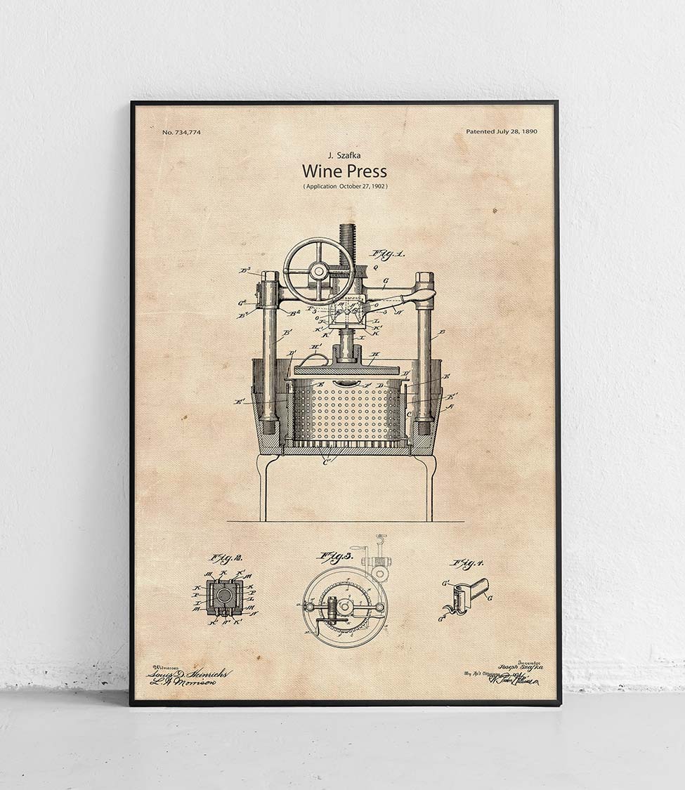 A poster featuring a reproduction of Joseph Szafek's patent for a wine press.