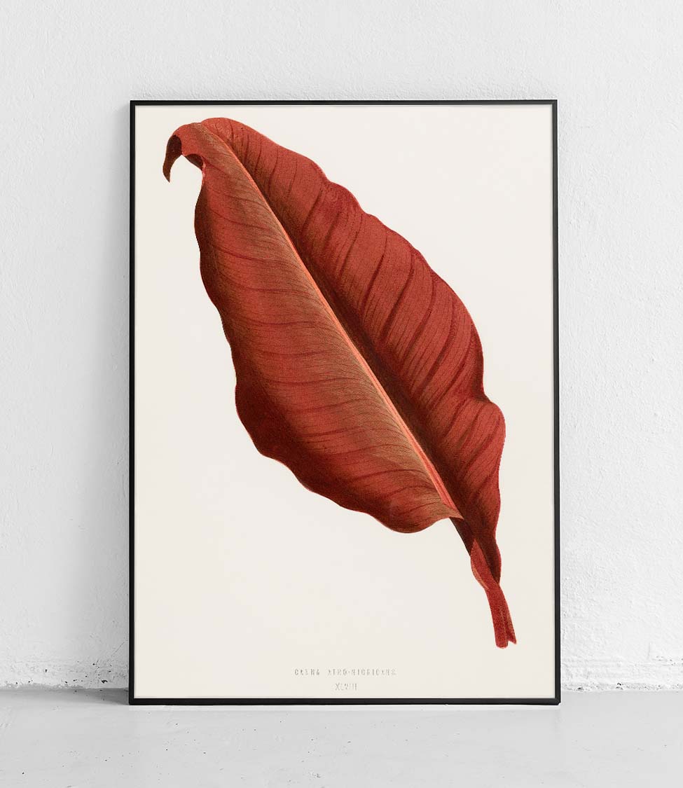 This original illustration of "Canna - Atro Nicricans" from the book "Beautiful Leaved Plants" by Shirley Hibberd (1870) is a vintage botanical print depicting a magnificent single red leaf.
