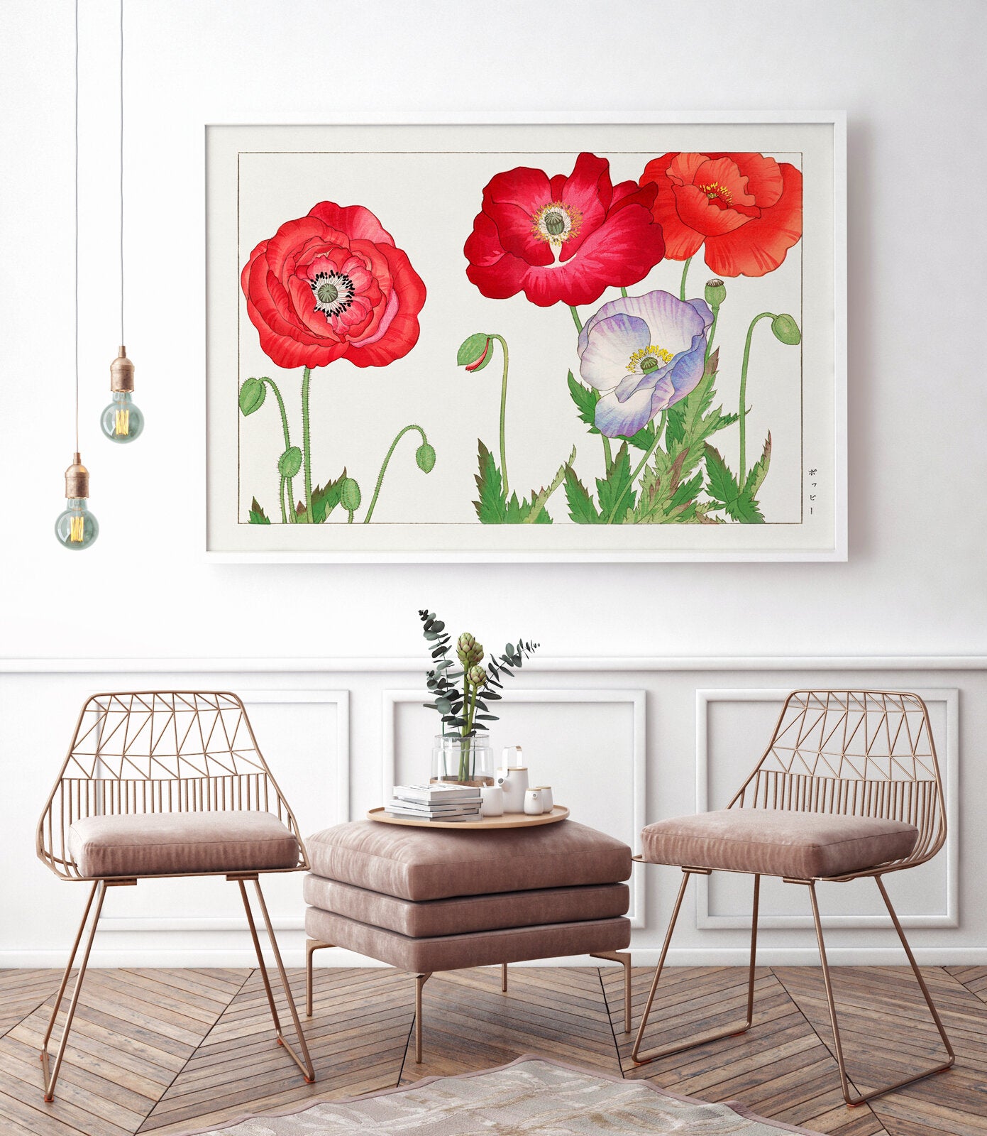 The illustration depicts "Poppies." The woodblock print was created by Tanigami Konan, a painter and textile designer from Osaka.
