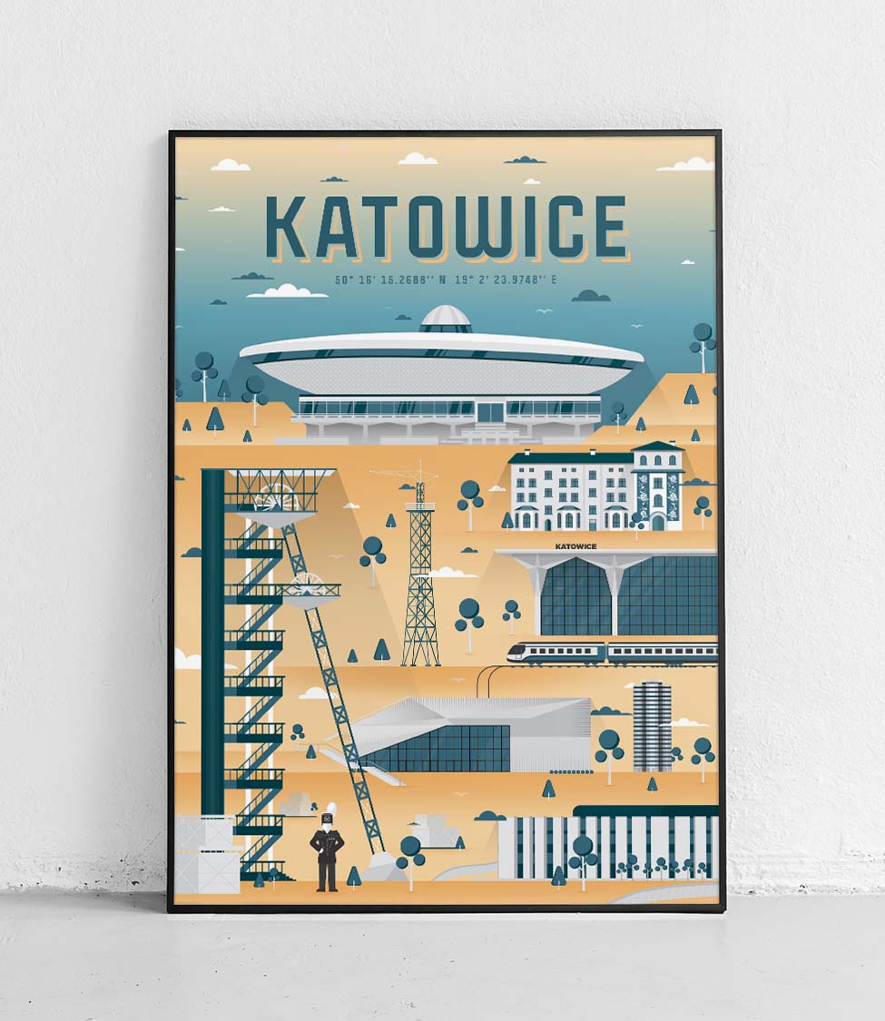 The poster depicts symbols of Katowice, including the Spodek Arena, a mine shaft, the PKP railway station, the post office, the parachute tower, and the NOSPR concert hall.