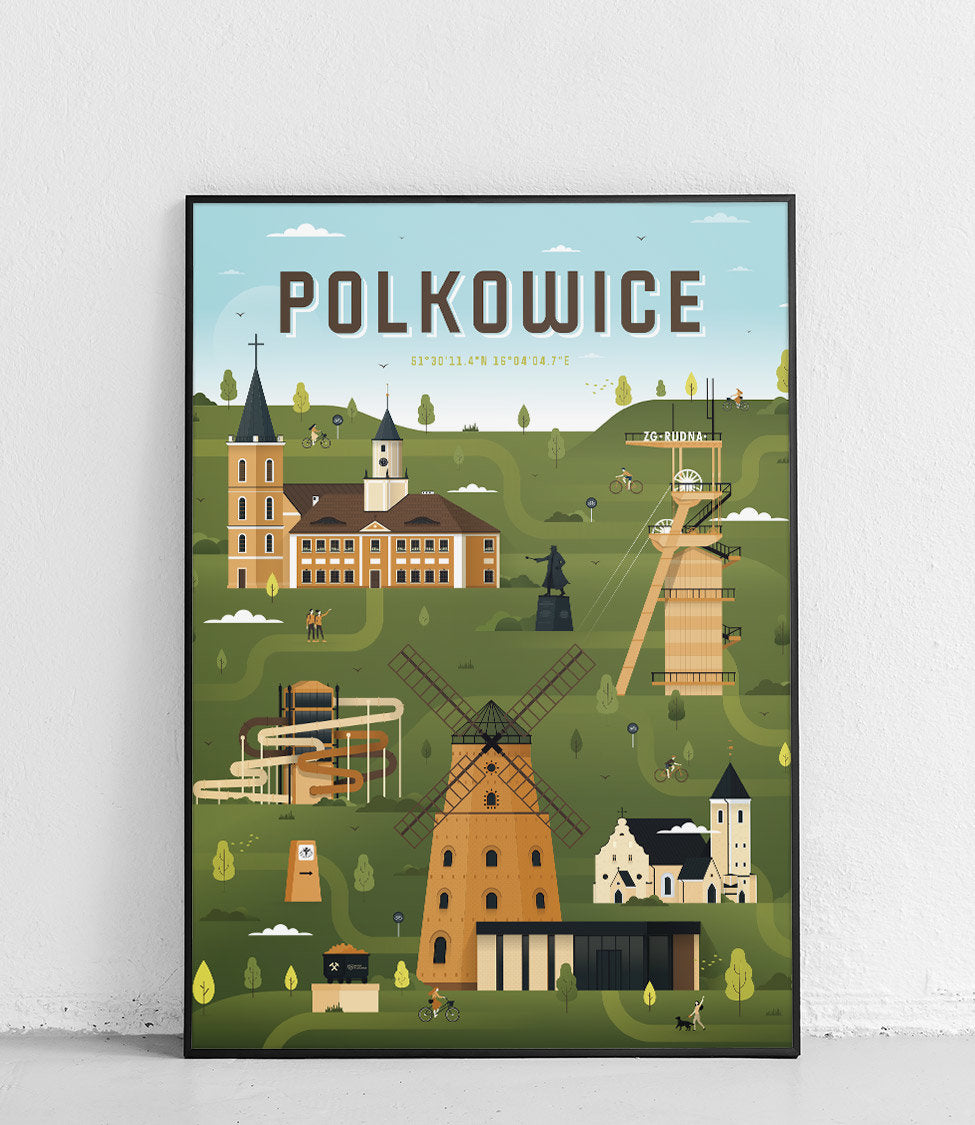 This poster from the "Cities" series depicts the most famous symbols of Polkowice, including: