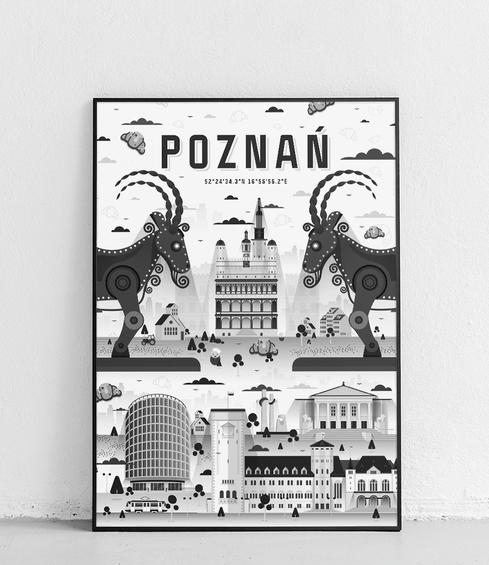 The poster depicts Poznań's greatest symbols: the Roundabout, the Billy Goats, the Two Crosses Monument, the Castle with its clock tower, the Town Hall, the potato, and the croissant.