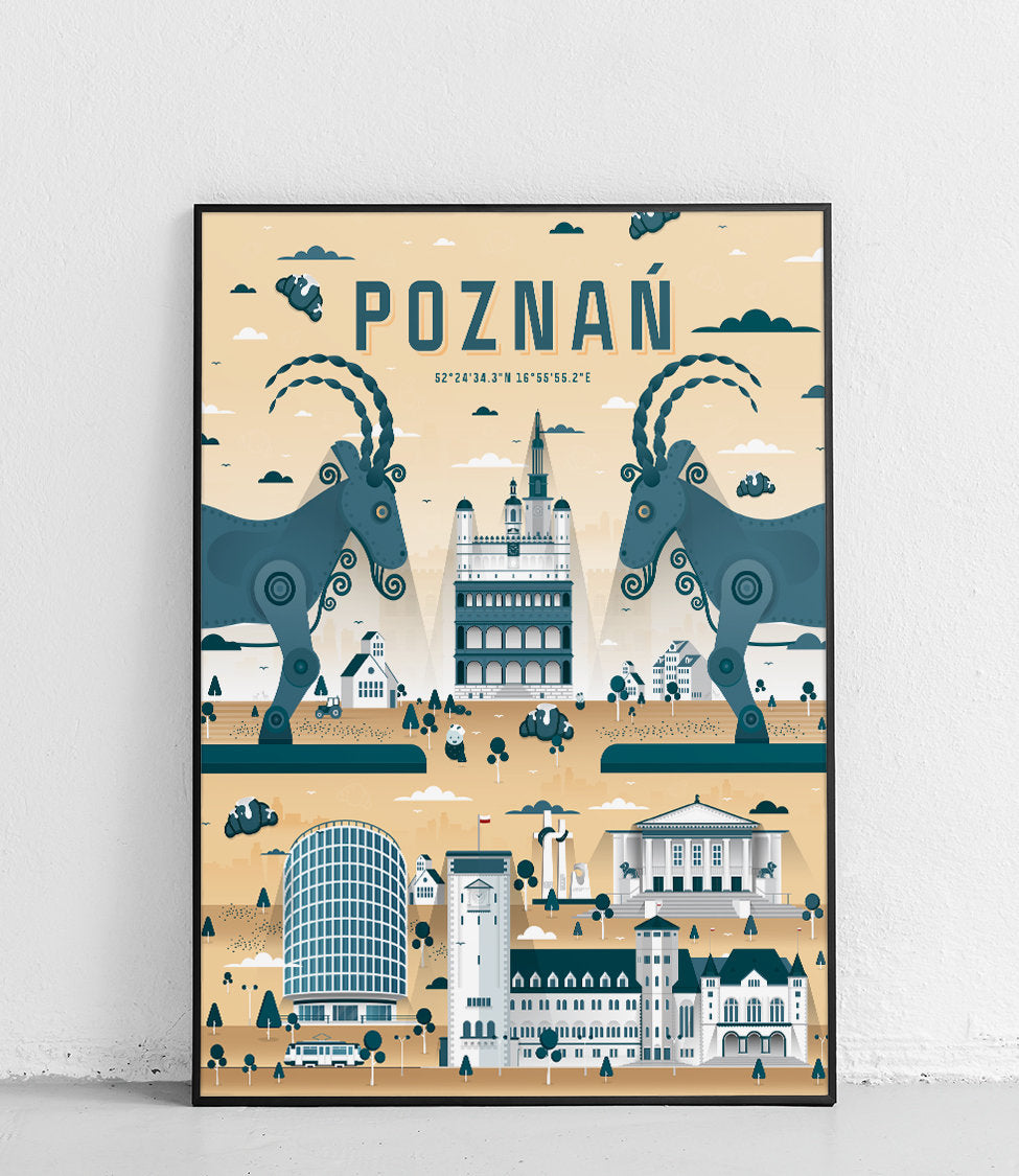The Poznań poster from the "Cities" series depicts Poznań's greatest symbols, including: