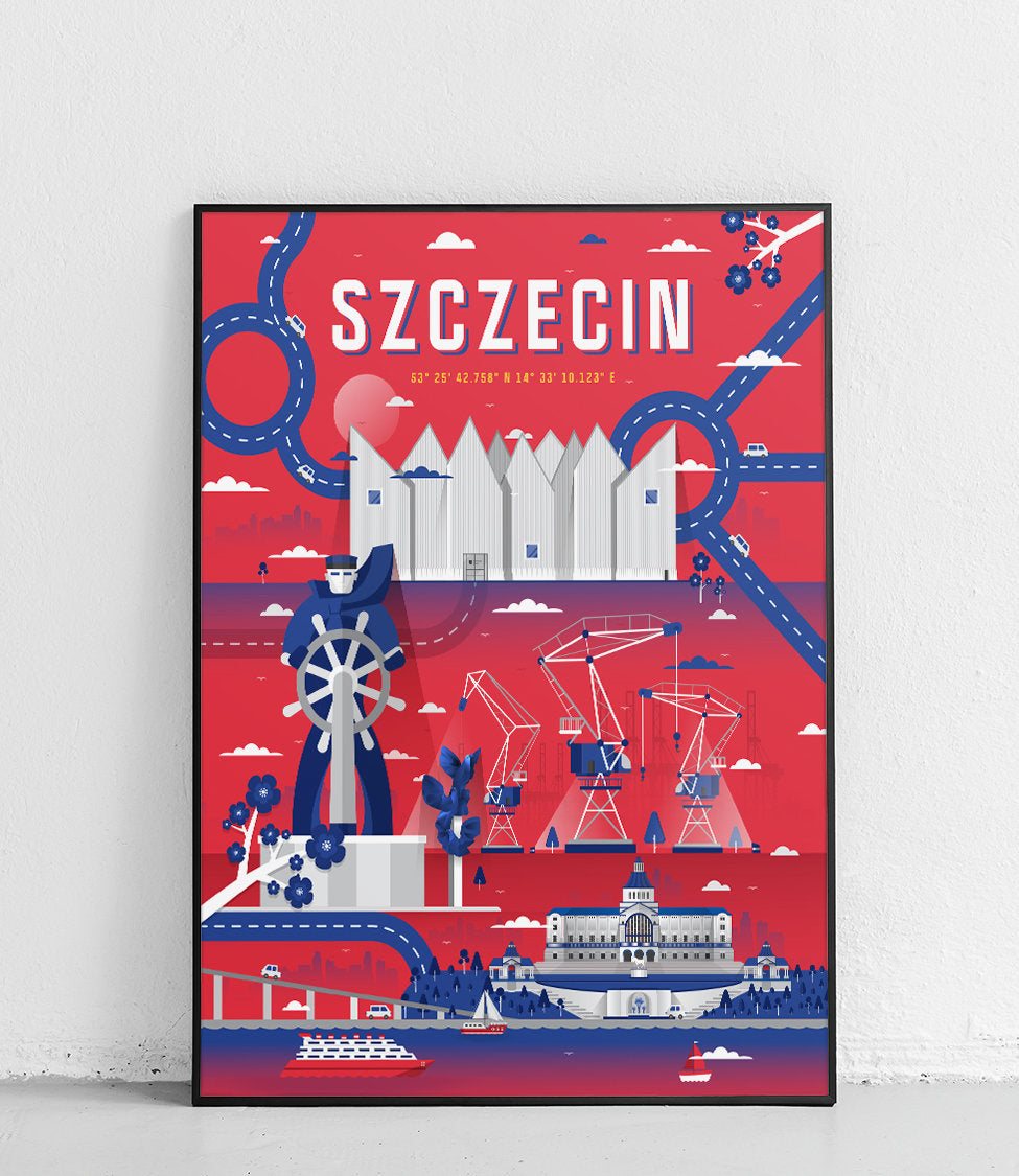 is another unique project in the City poster series.The urban bustle of Szczecin's buildings and famous, ubiquitous roundabouts, combined with relaxation on the Chrobry Embankment and admiring the ships moored there. It also features the Oder River and the beautiful Szczecin Lagoon.