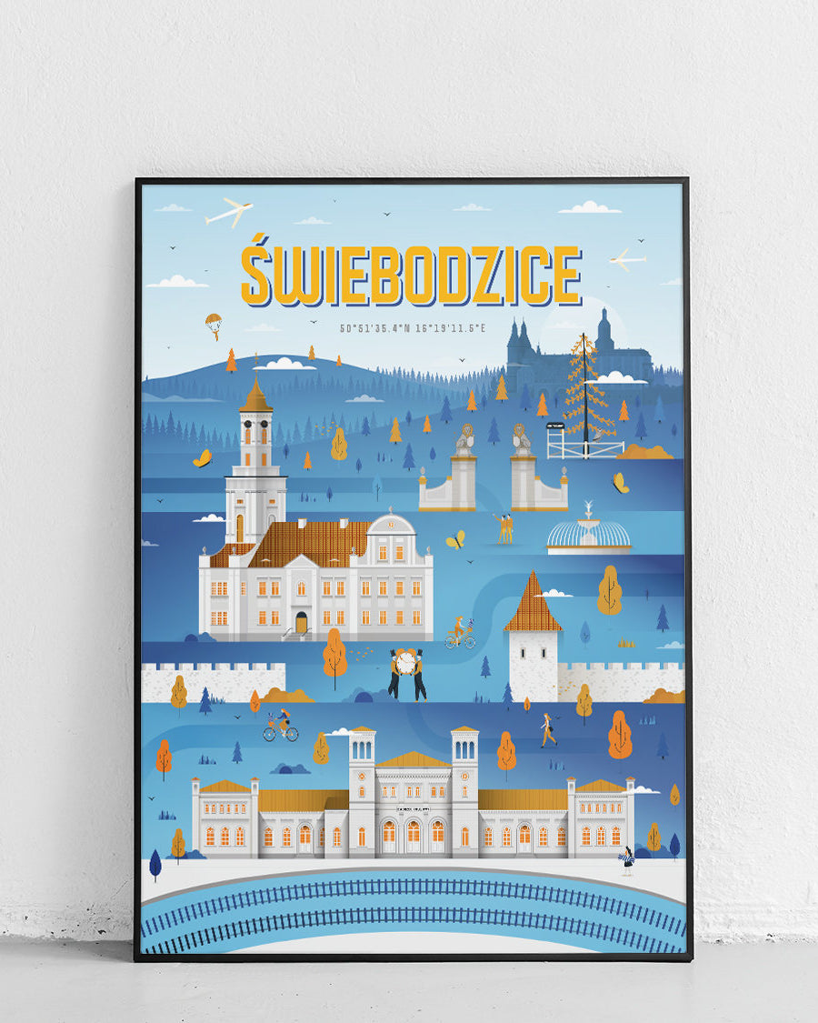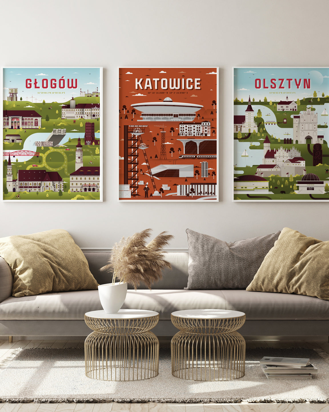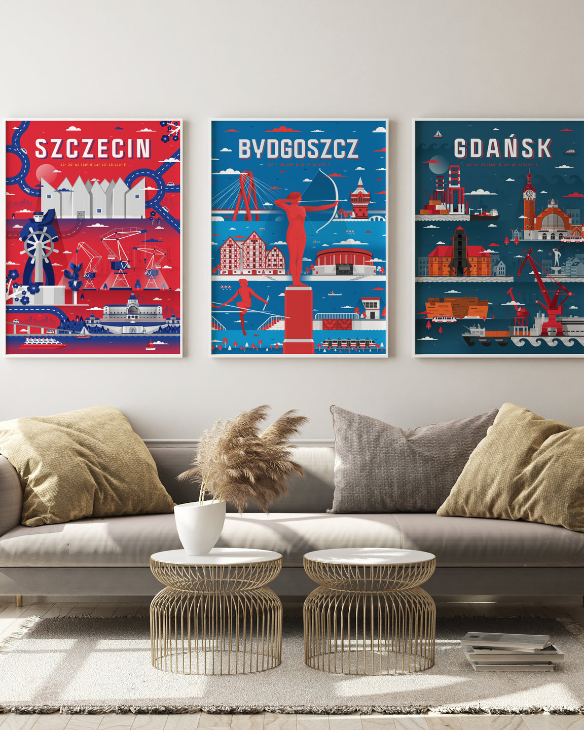 The "Polish Cities" collection is a series of original posters depicting the most beautiful Polish cities – from vibrant Warsaw to intimate, charming towns. Each illustration was designed by Wrocław-based artist Robert Kostrzewa. It's not just decoration, but also a way to express your love for your city.