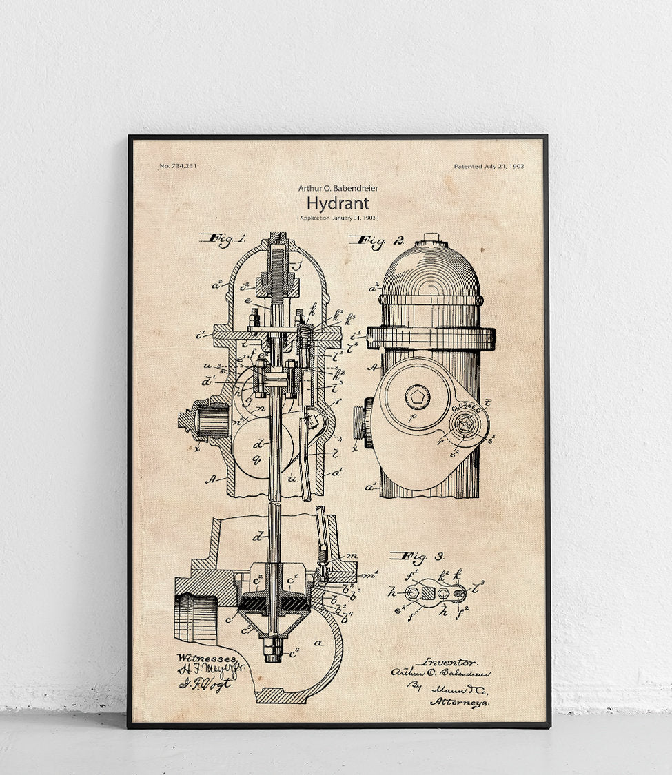 A poster featuring a reproduction of Arthur O. Babendreier's fire hydrant patent.