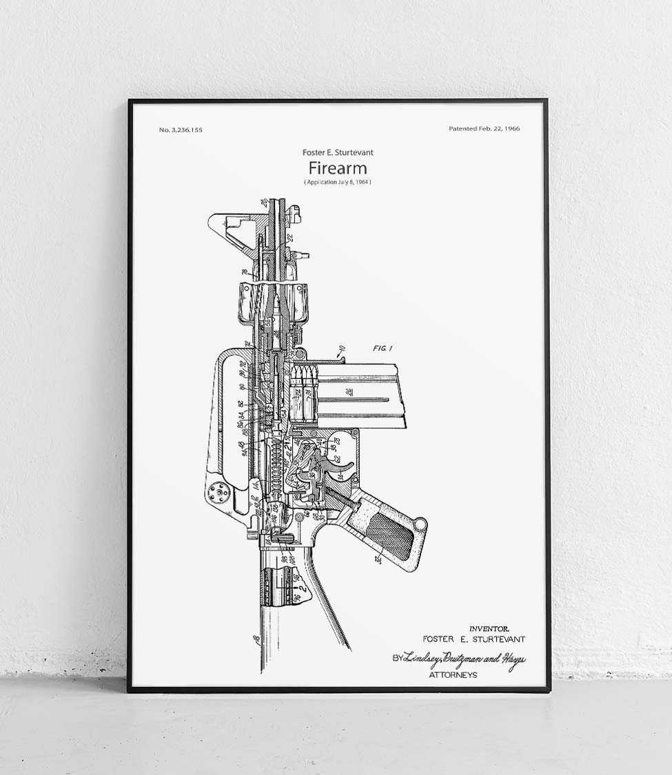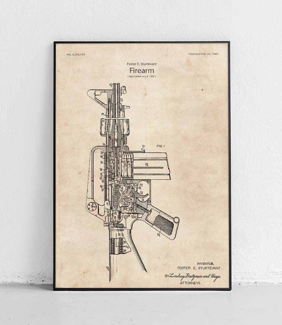 A patent poster featuring the M16A1 rifle, by Foster E Sturtevant.