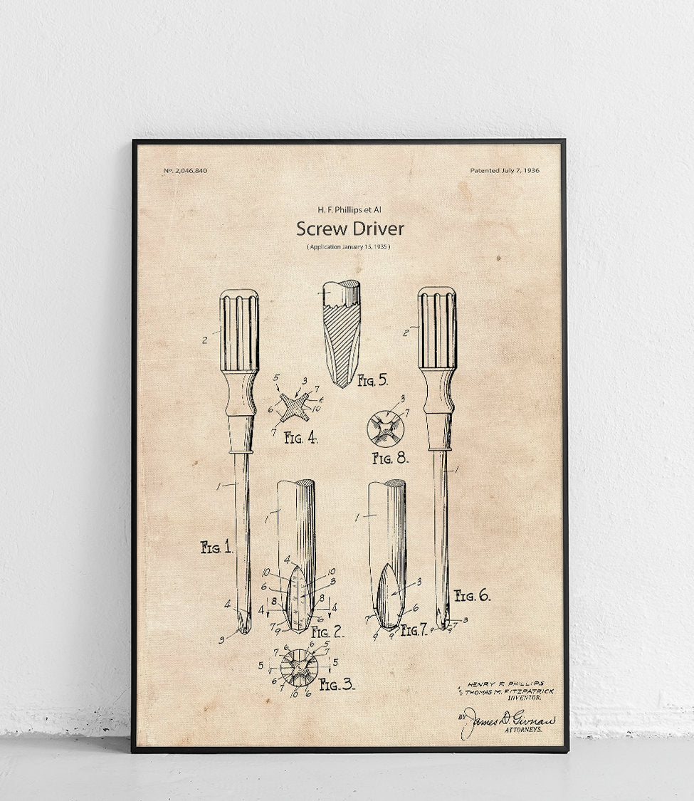 A patent poster featuring a screwdriver by Henry F. Phillips and Thomas M. Fitzpatrick.
