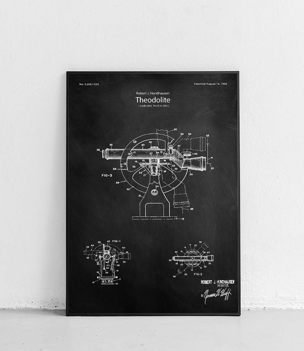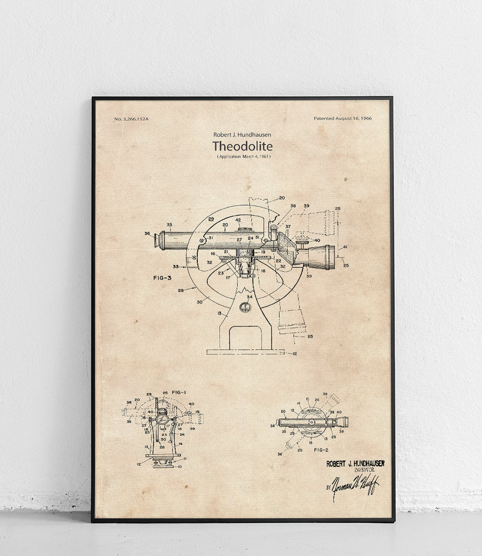 A poster with a reproduction of Robert J. Hundhausen's patent for a theodolite, a surveying instrument used to measure horizontal and vertical angles.