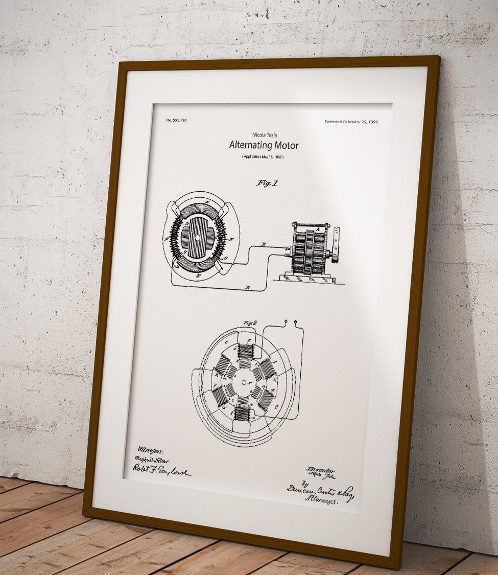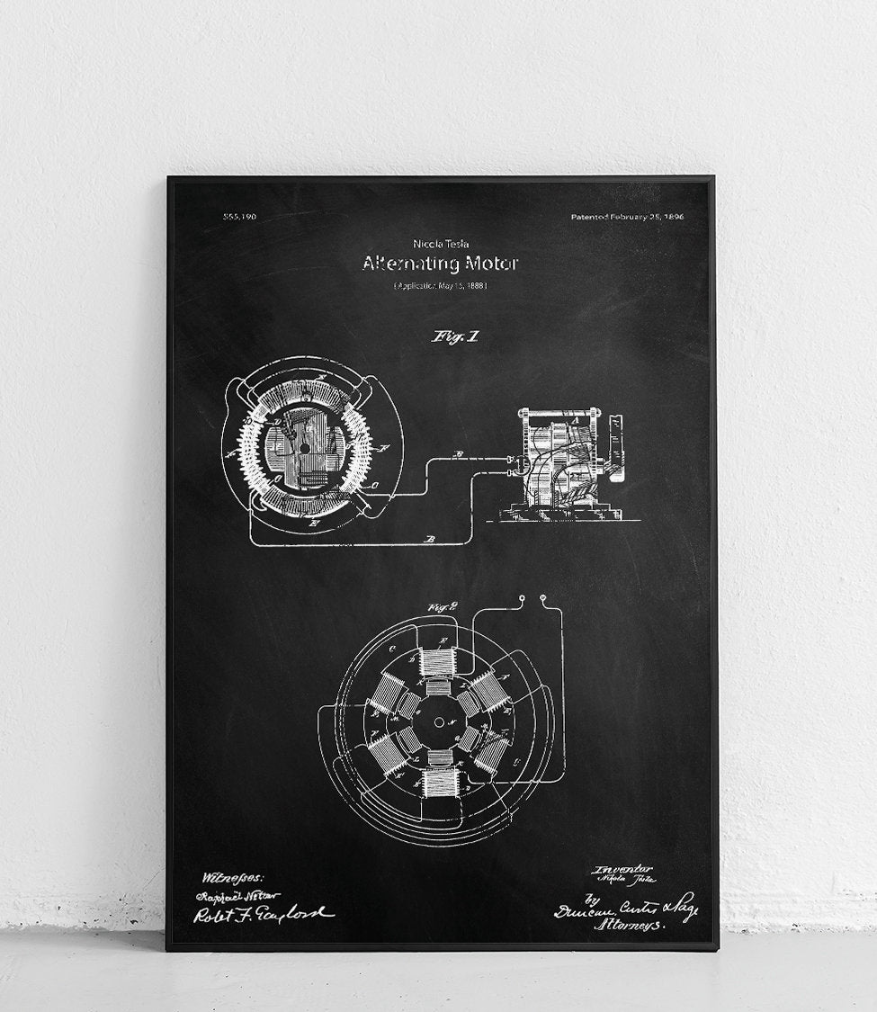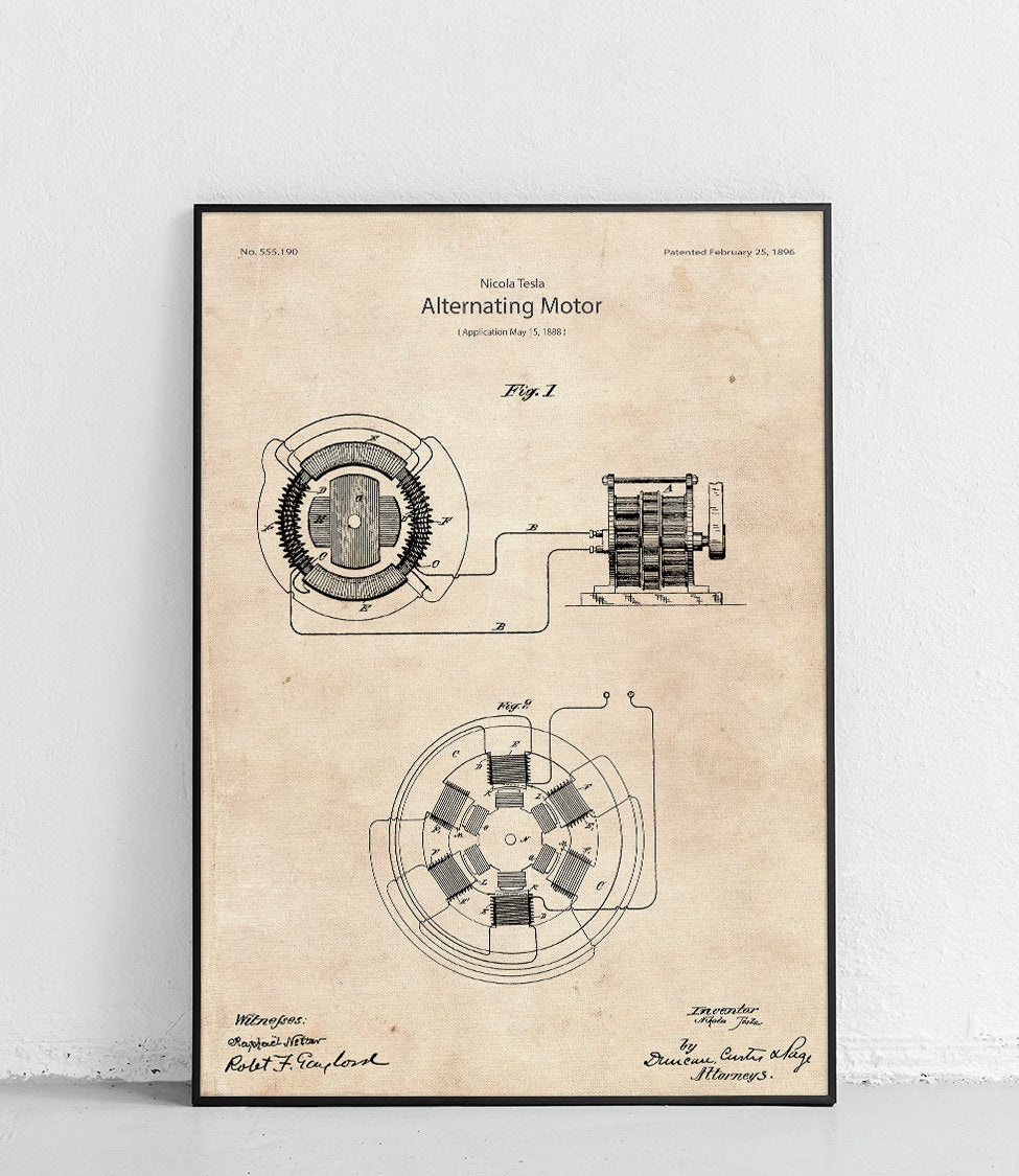 A poster featuring a patent reproduction of Nikola Tesla's AC motor.