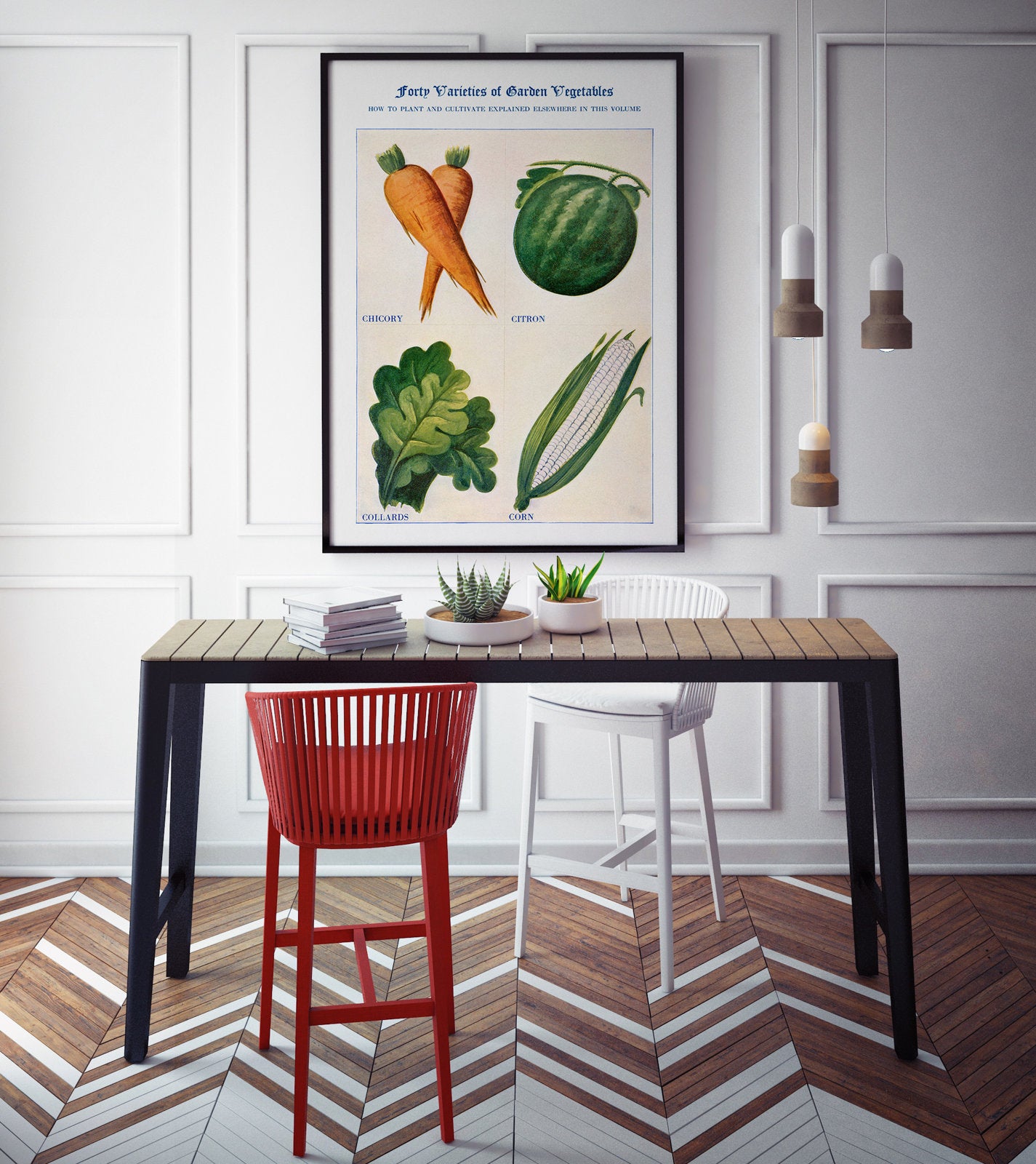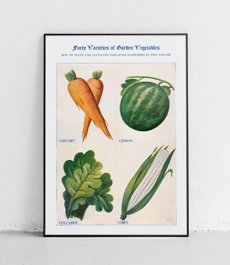 Watercolor illustration of garden vegetables "Chicory, citron, corn, collard greens" from the 1915 book "The Open Door to Independence" by Thomas E. Hill.