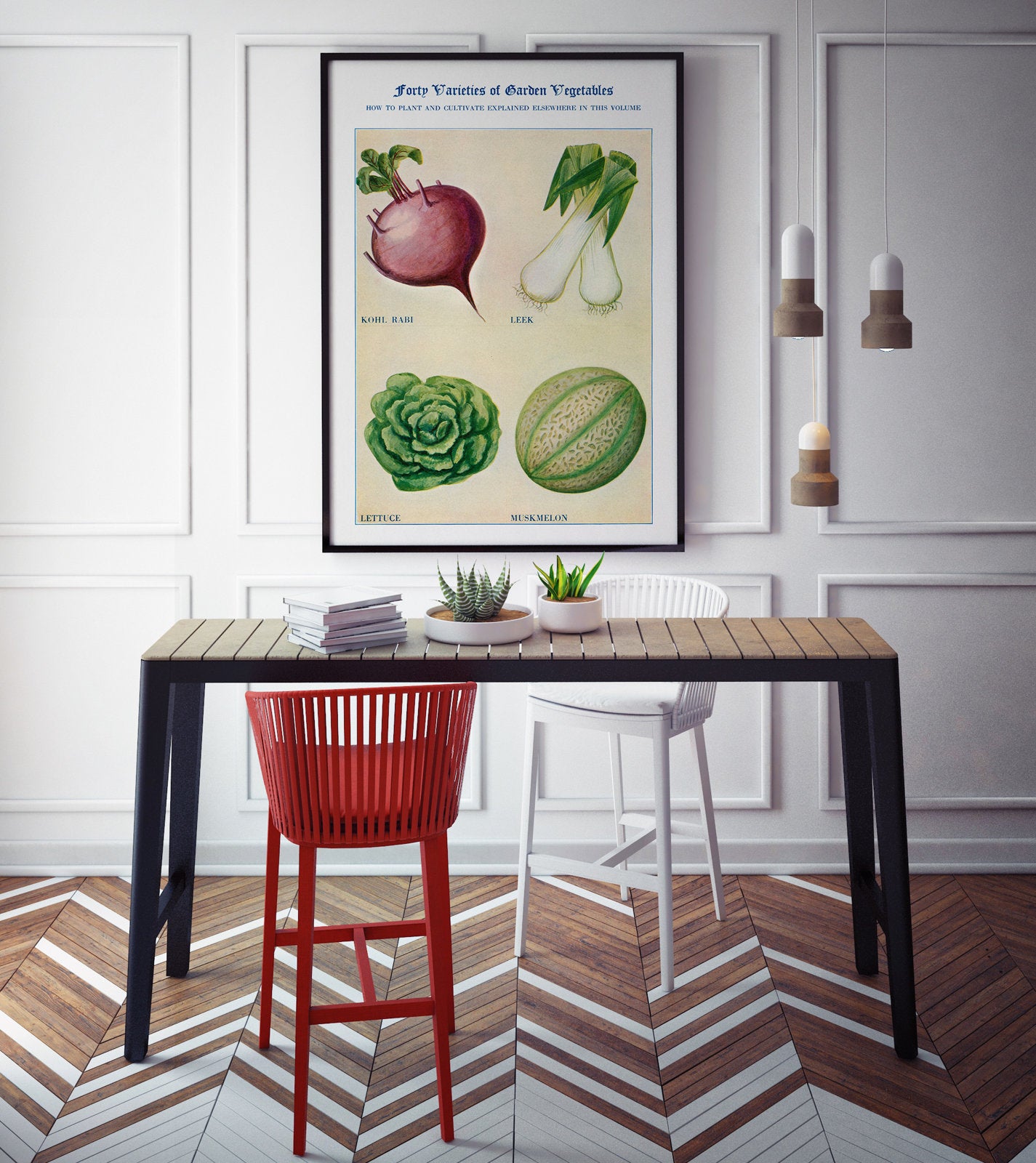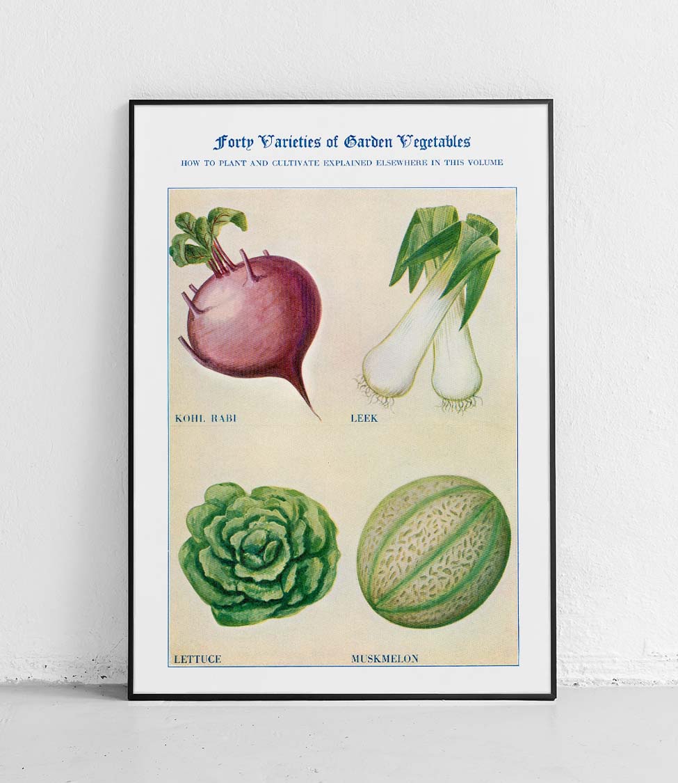 Watercolor illustration of garden vegetables "Kohlrabi, leek, lettuce, musk melon" from the 1915 book "The Open Door to Independence" by Thomas E. Hill.