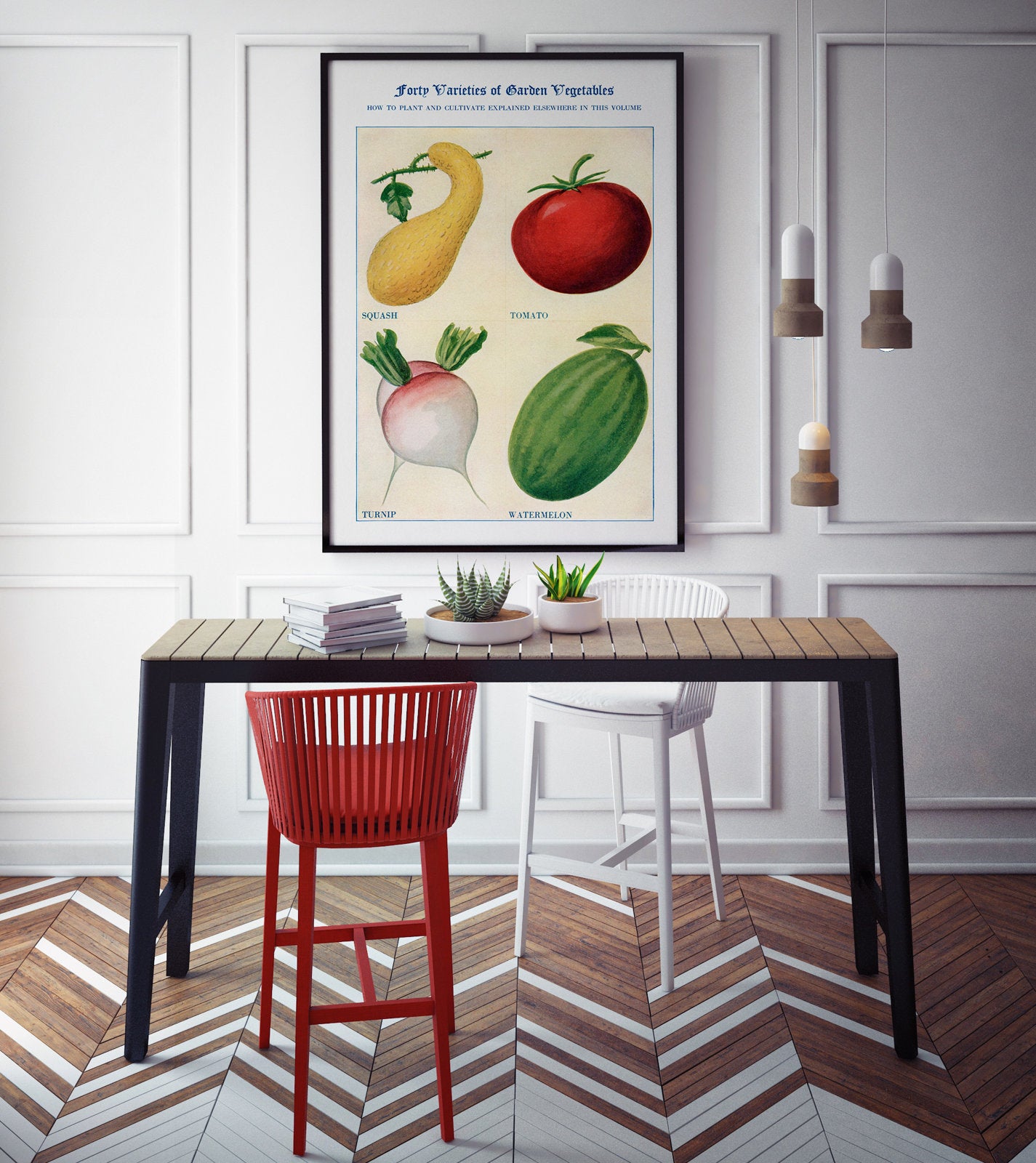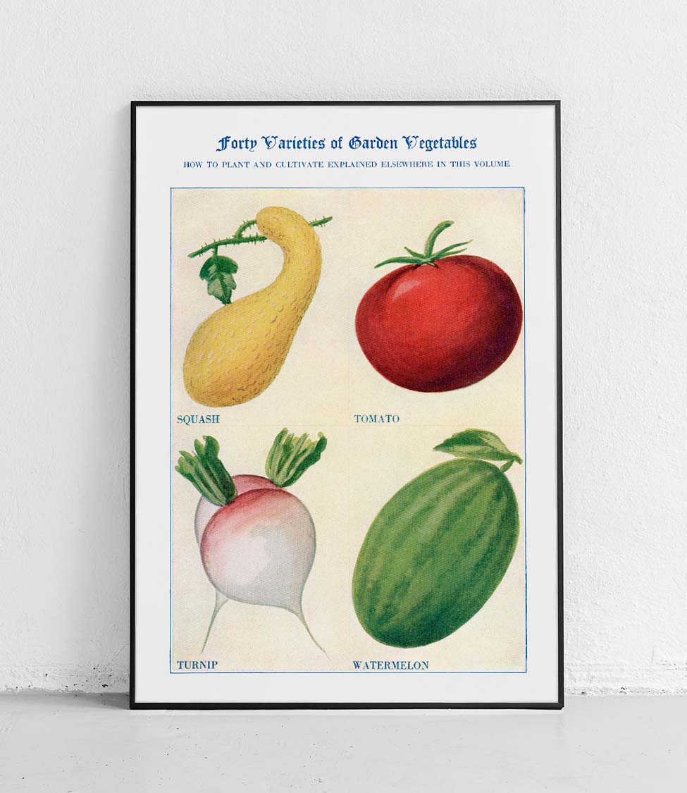 Watercolor illustration of garden vegetables "Squash, Tomato, Turnip, Watermelon" from the 1915 book "The Open Door to Independence" by Thomas E. Hill.