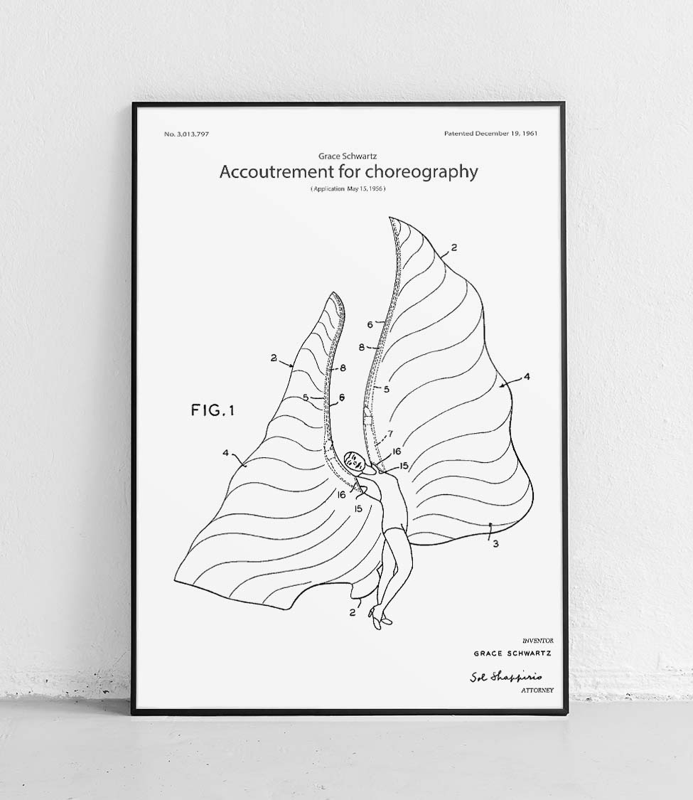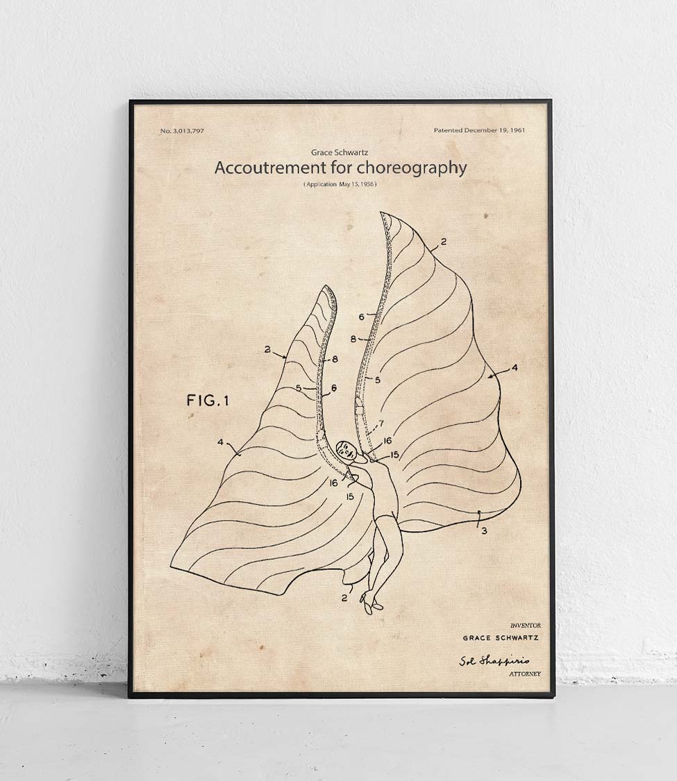A poster featuring a patent reproduction of a choreography accessory that can be worn by dancers to create choreographic effects, including a butterfly movement, by Grace Schwartz.