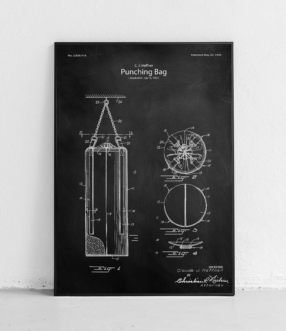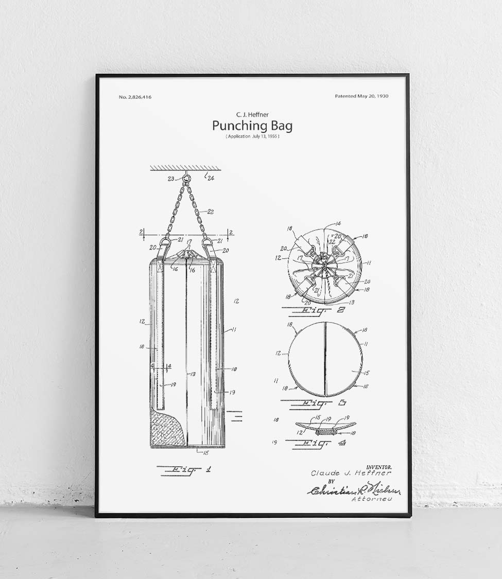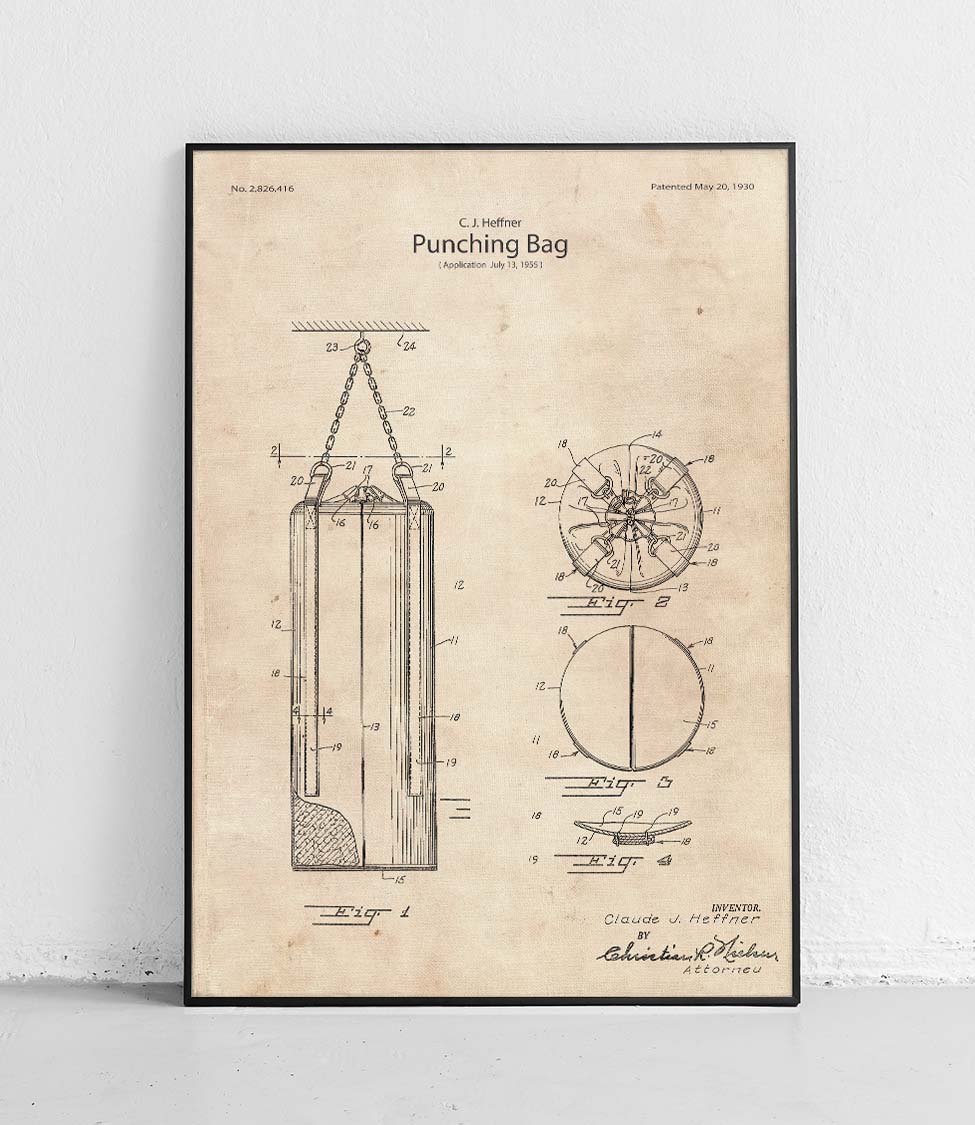 A patent poster featuring a boxing punching bag, designed by Claude James Helfner.