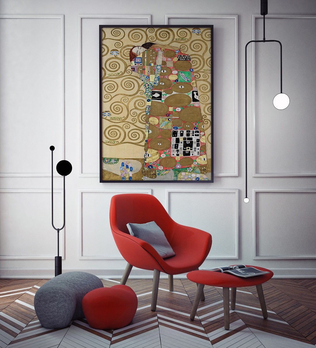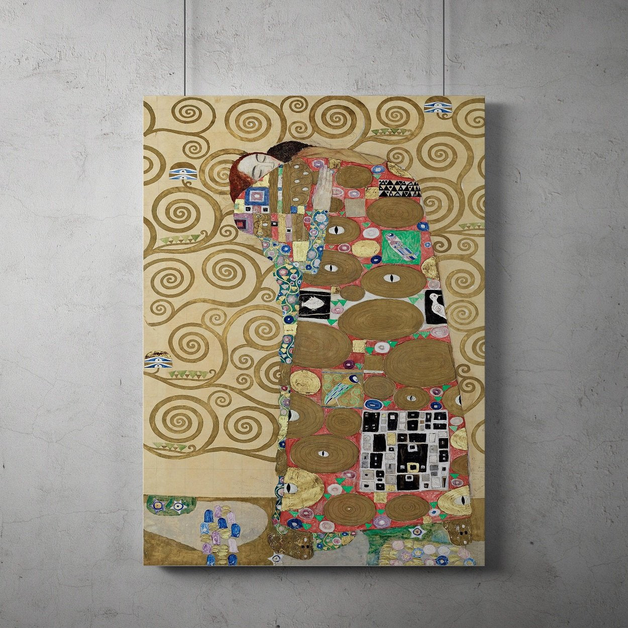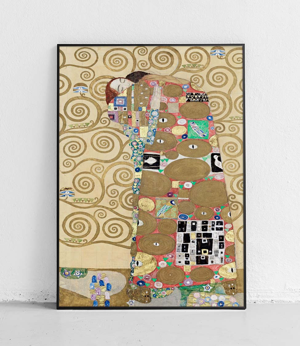 The attached print depicts "Fulfilment" painted in 1905. Fulfilment is a reworking of the theme from the last movement of the Beethoven Frieze, the Chorus of Angels of Paradise, and precedes The Kiss. The three couples are very similar; the man, with his back to the viewer, shields his lover's body and reveals her delighted face.