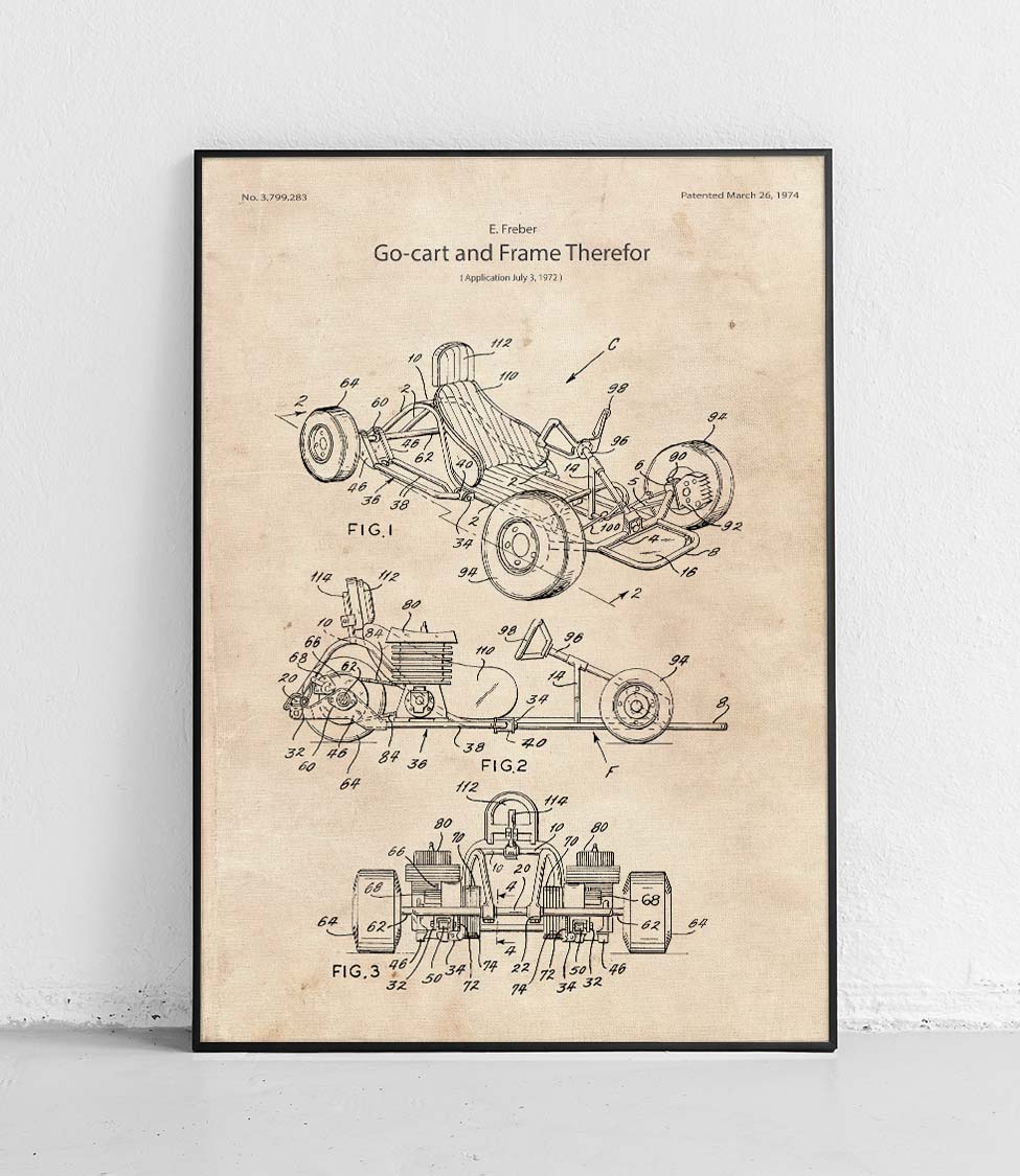 A poster featuring a patent reproduction of a go-kart by Elmer C. Freber.