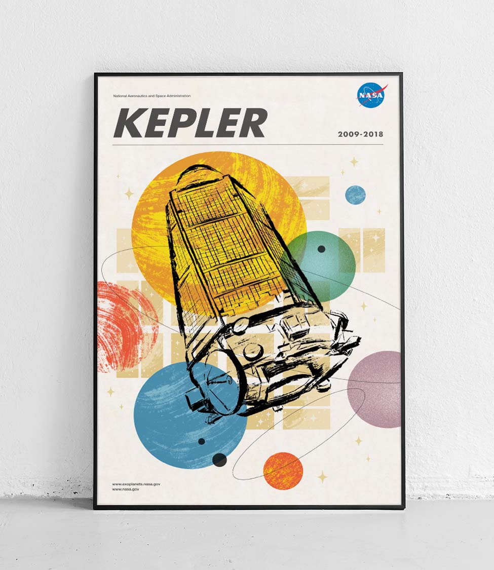 The Kepler Space Telescope is a unique poster from NASA. The poster is from a series of five posters depicting NASA space telescopes searching for Earth-like exoplanets.