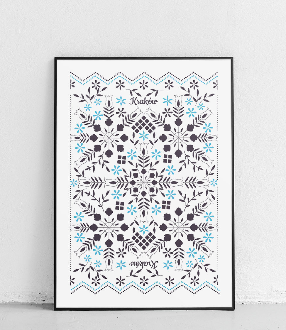This poster depicts the Krakow pattern, or more specifically, the Western Krakowiaks pattern, a characteristic folk pattern of the Krakowiaks ethnographic group living in Lesser Poland. The Krakow pattern and costume are considered national costumes, very often worn and used today.