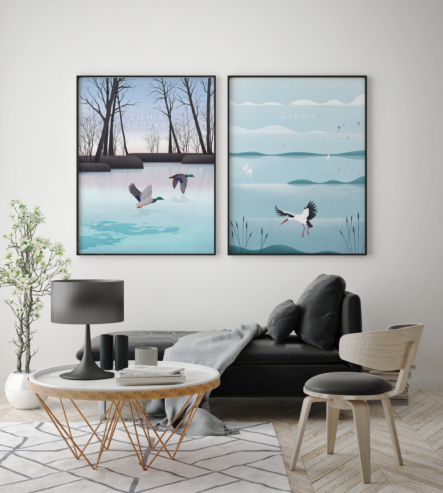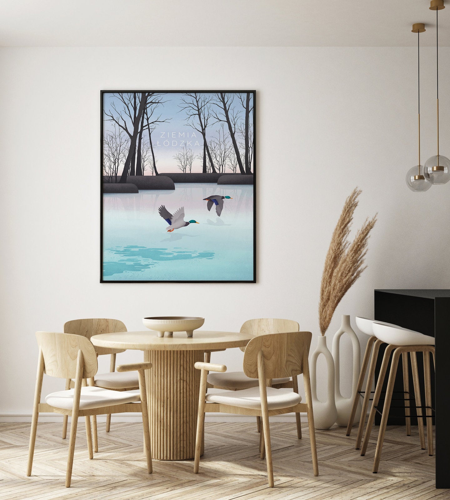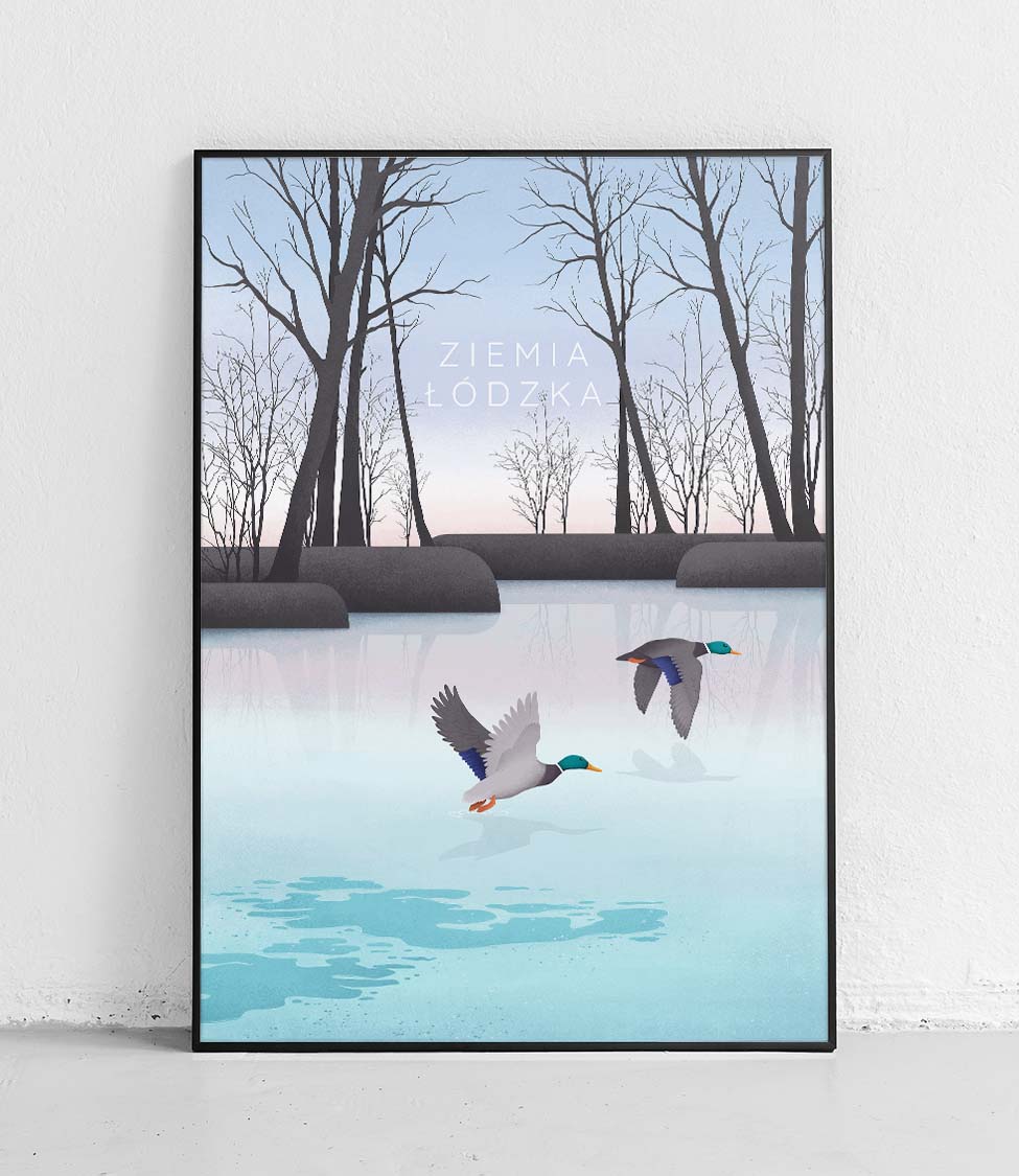 a beautiful geographical region located in central Poland. Geographical and ecological diversity, rich plant communities, numerous wild animal populations, rare bird species, and picturesquely situated water bodies delight and make the region's nature unique. Among the natural gems of the Łódź Region, the Blue Springs Reserve in Tomaszów Mazowiecki is worth mentioning, which is the subject of our poster. Located in the Pilica Valley, on the right bank of the river, in the southeastern part of the city of Tomaszów Mazowiecki. The springs are karst springs, some of the most interesting karst phenomena in Europe. The main aquifer complex consists of fractured Jurassic limestone, from which water gushes, taking on a blue-blue-green hue. The color of the water in the spring pools is the result of diffused sunlight. The water's color changes depending on the weather, including sunshine and cloud cover. Pulsating geysers made of sand kicked up by the spring water add to the karst spring's charm. The reserve's symbol is the mallard duck, and it is it that is featured on our poster.The Łódź Land poster was created by Poznań-based artist Katarzyna Nowakowska. Made especially for us. See also other posters from the REGIONS OF POLAND series in our gallery.