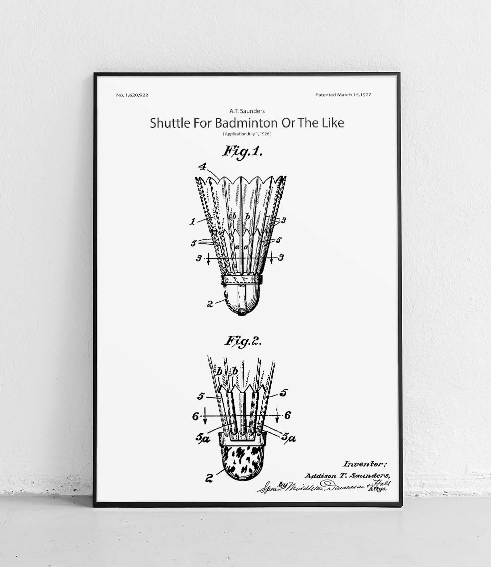 A poster featuring a patent reproduction of a badminton shuttlecock by Addison T. Saunders.