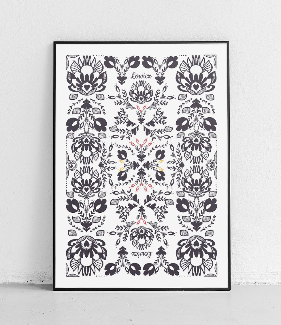 This poster depicts the hunting pattern, also known as the princely pattern, of the people inhabiting the fertile lands of Mazovia, in the valley of the Bzura River and its numerous tributaries. The Łowicz costume is one of the richest and most striking costumes not only in Mazovia but throughout Poland, still worn and used today.