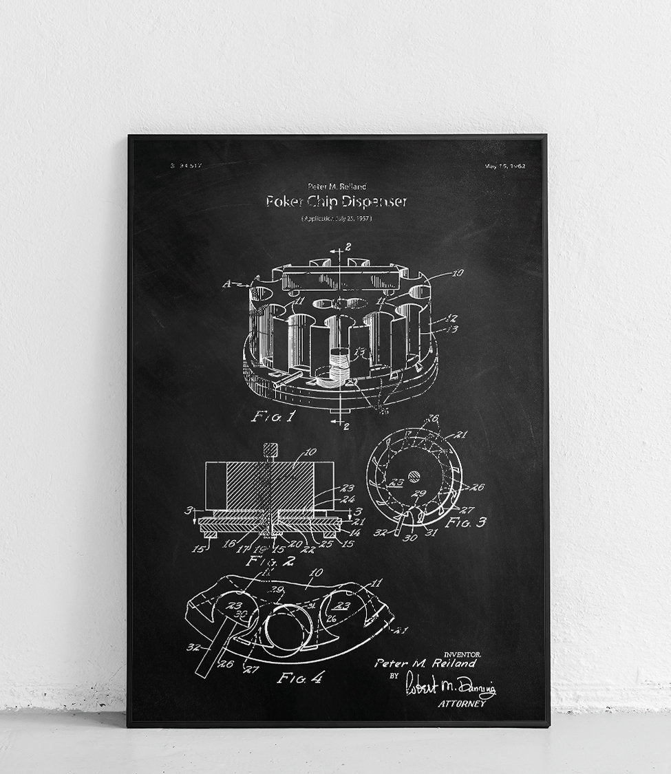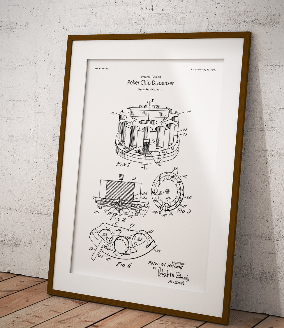 A poster featuring a patent reproduction of Peter M. Reiland's poker chip dispenser.