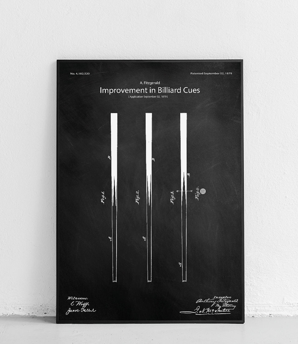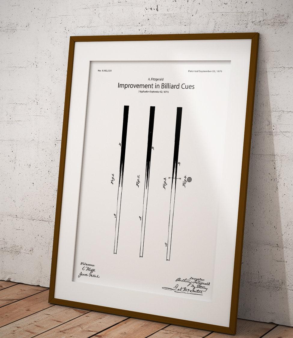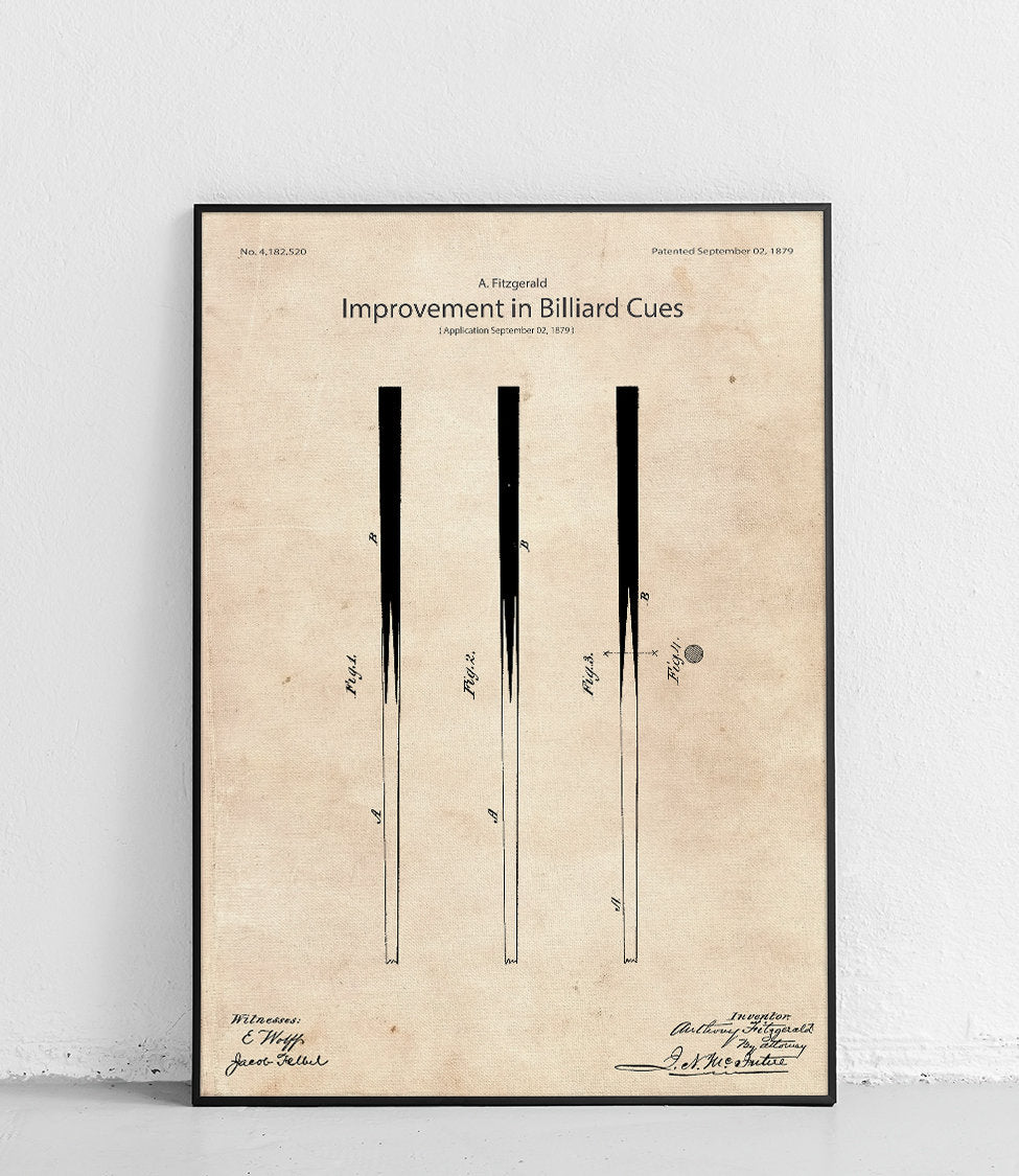 A poster featuring a reproduction of a billiard cue patent by Anthony Fitzgerald.