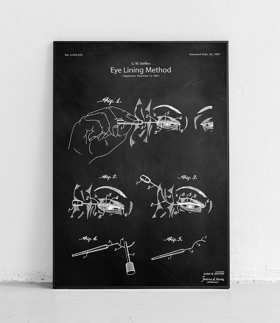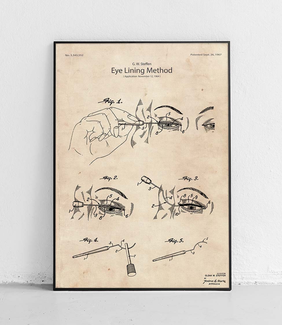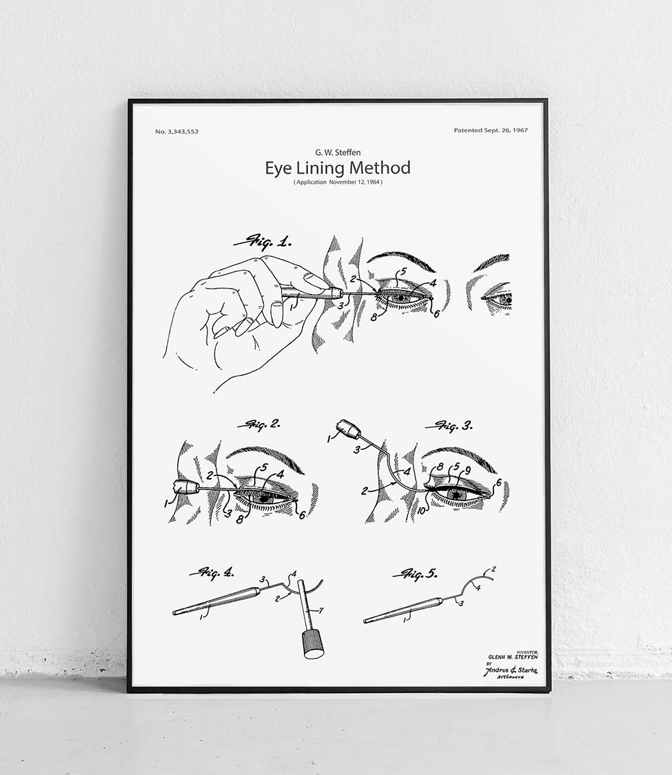 A poster featuring a patent reproduction of Glenn W. Steffen's eyeliner applicator.
