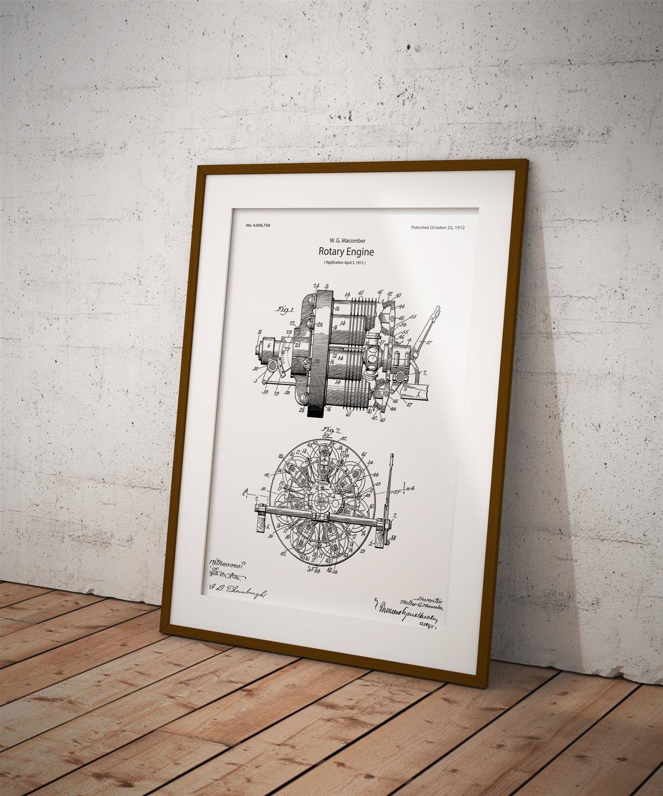 A poster featuring a reproduction of Walter G. Macomber's patent for a rotary engine.