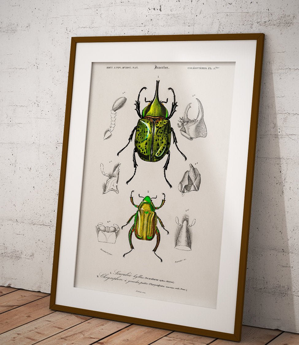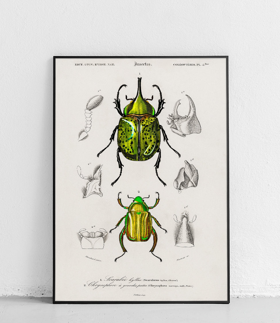 This original illustration from the "Animals" series was commissioned by the Universal Dictionary of Natural History by the French botanist and geologist Charles Henry Dessalines d'Orbigny, who lived from 1806 to 1876. The accompanying illustration depicts a Scarab (Scarabaeus Hyllus), a genus of beetles in the family Scarabaeidae, and a Chrysophora (Hrysopora mearopa), a family of beetles in the suborder Polyphagoides.