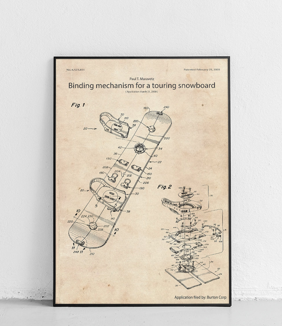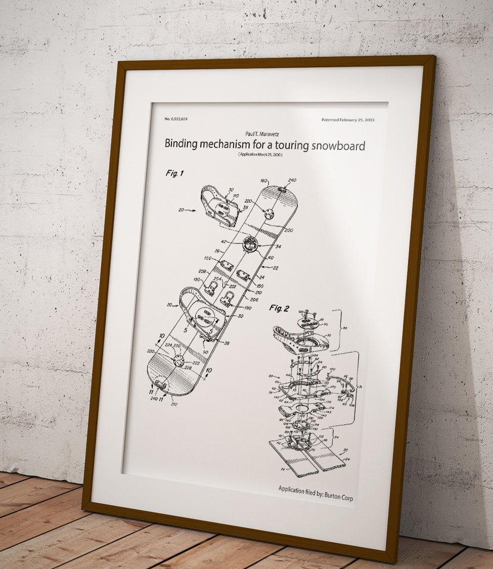 Patent poster featuring a snowboard by Paul T. Maravetz.
